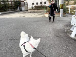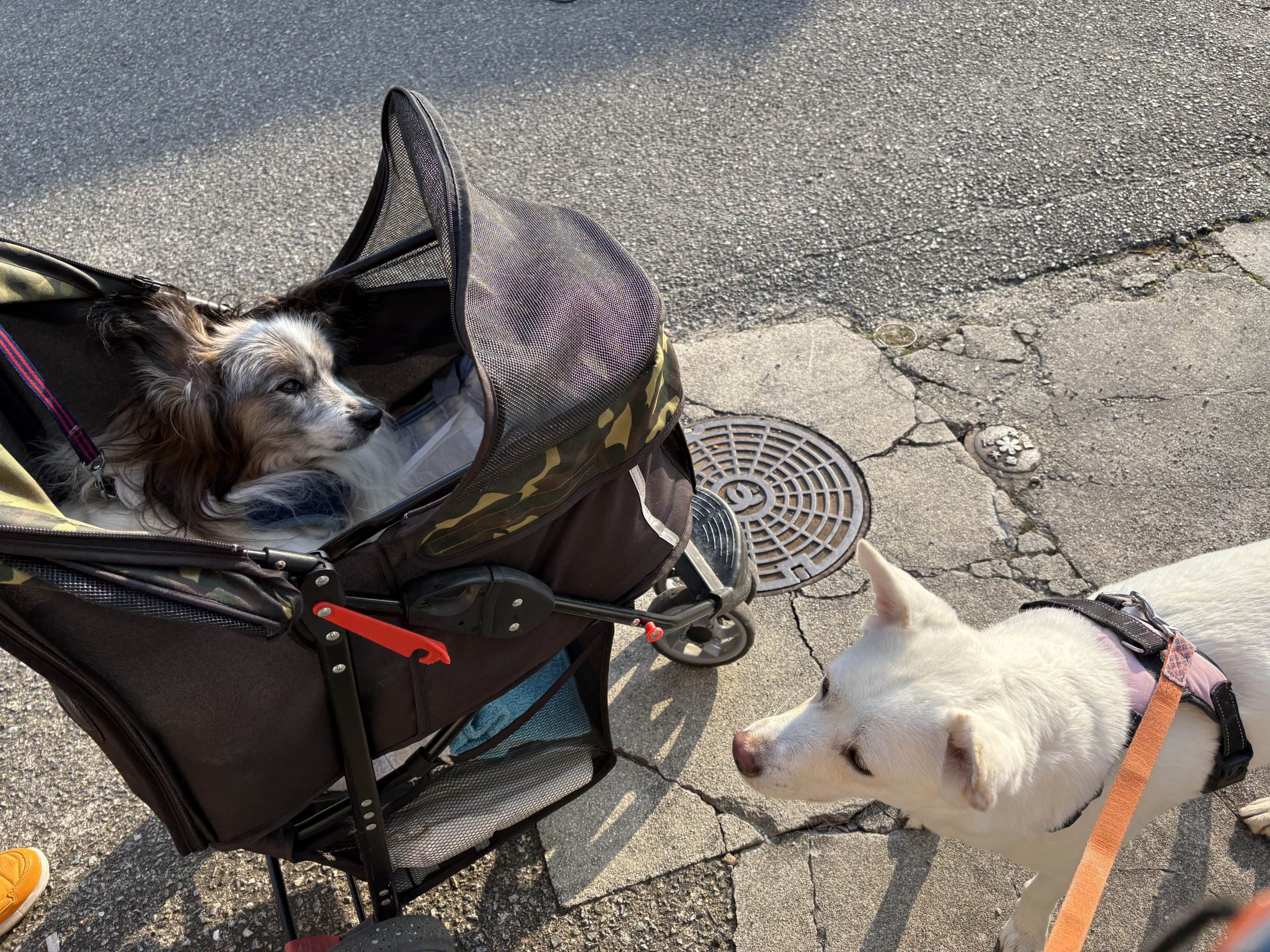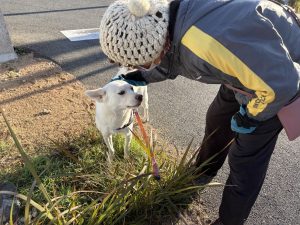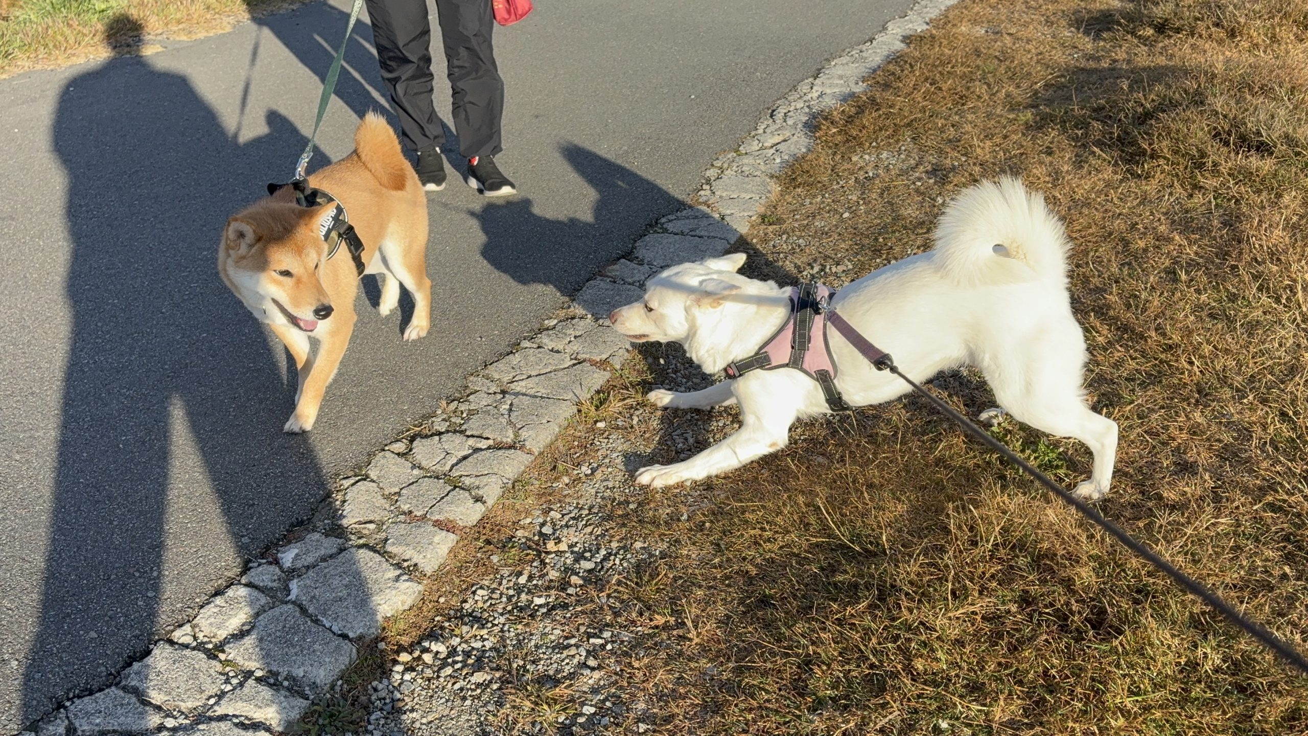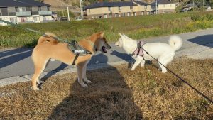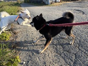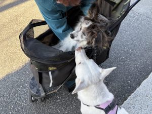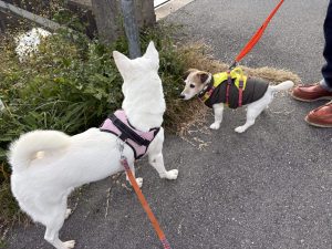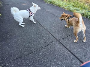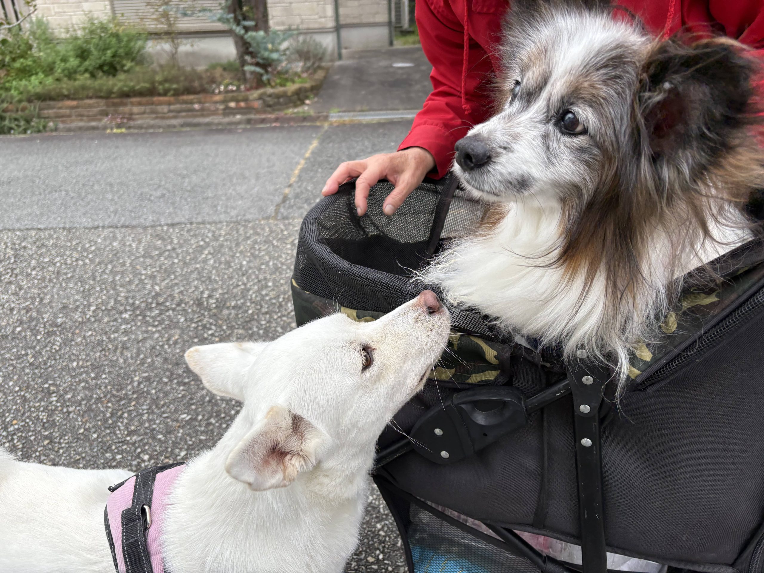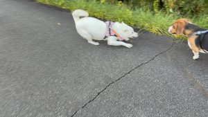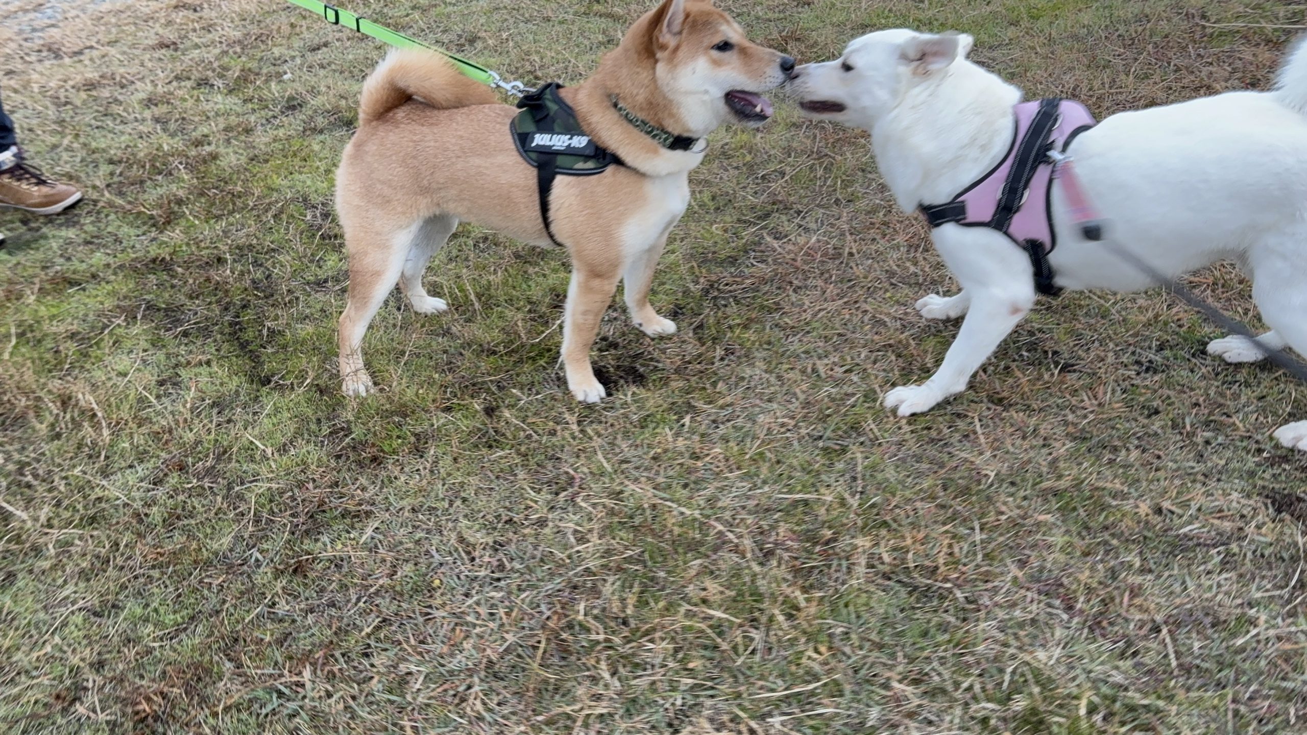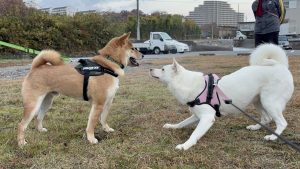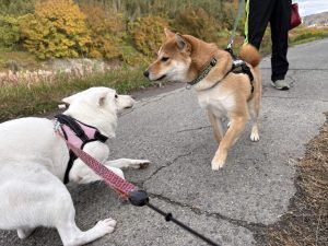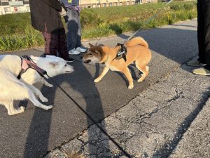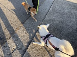 ヒラリちゃんは仕方なくお座りして、遠巻きにマルちゃんを見守りました(”◇”)ゞ