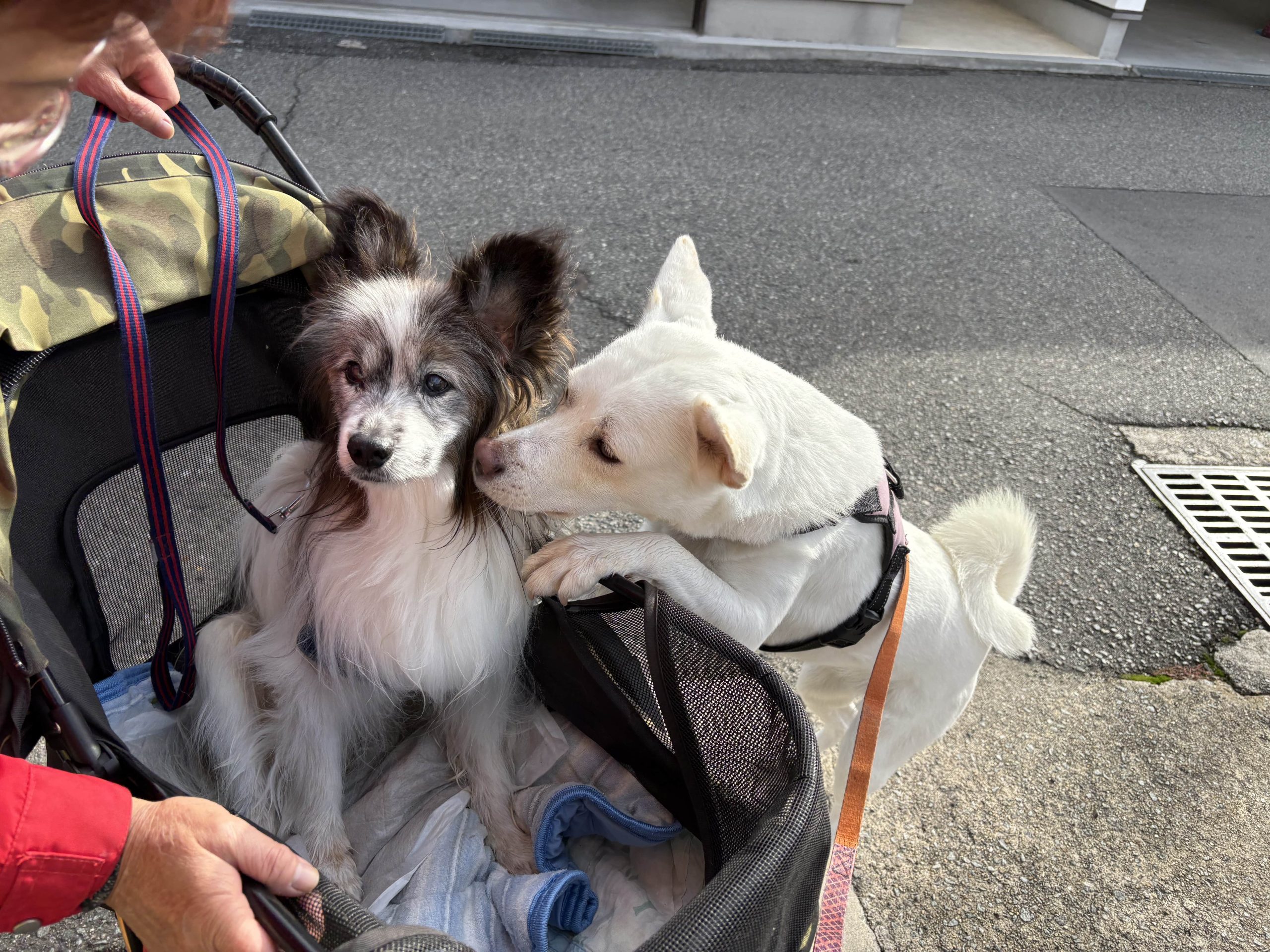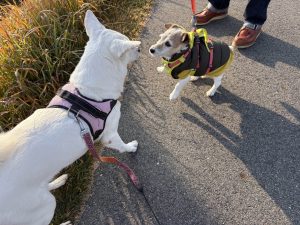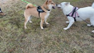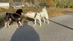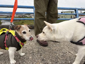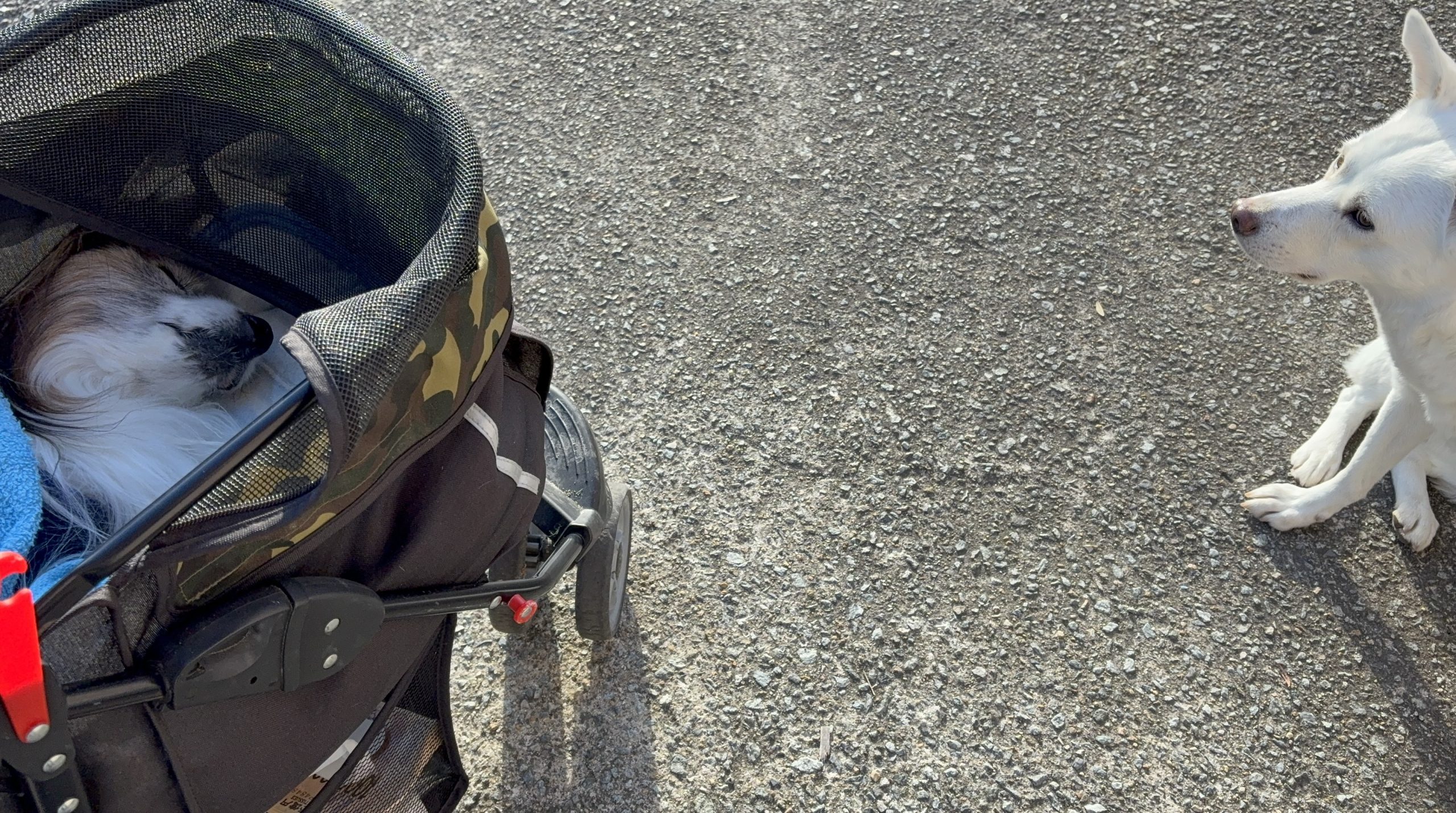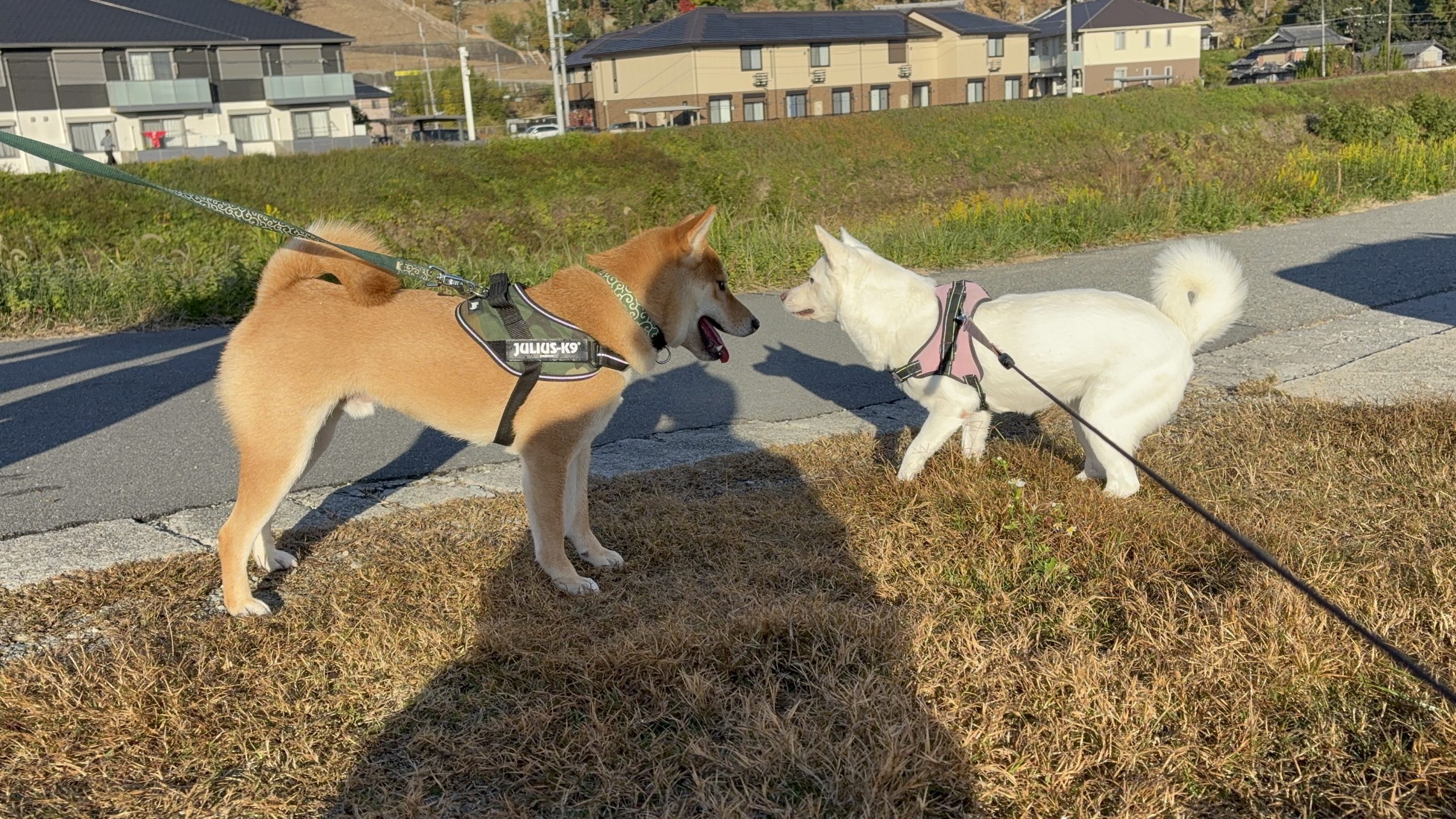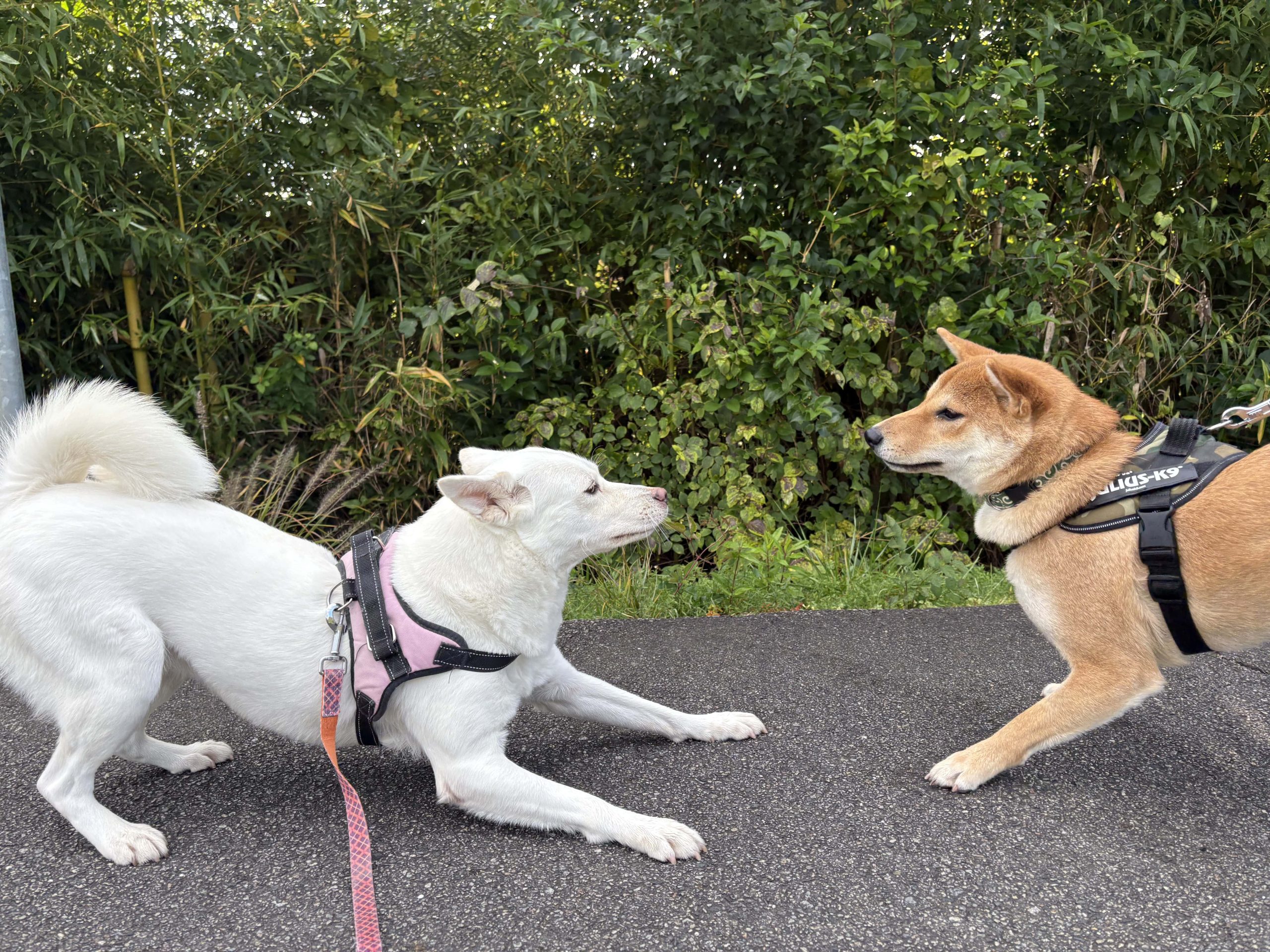 ヒラリちゃんは仕方なくお座りして、遠巻きにマルちゃんを見守りました(”◇”)ゞ