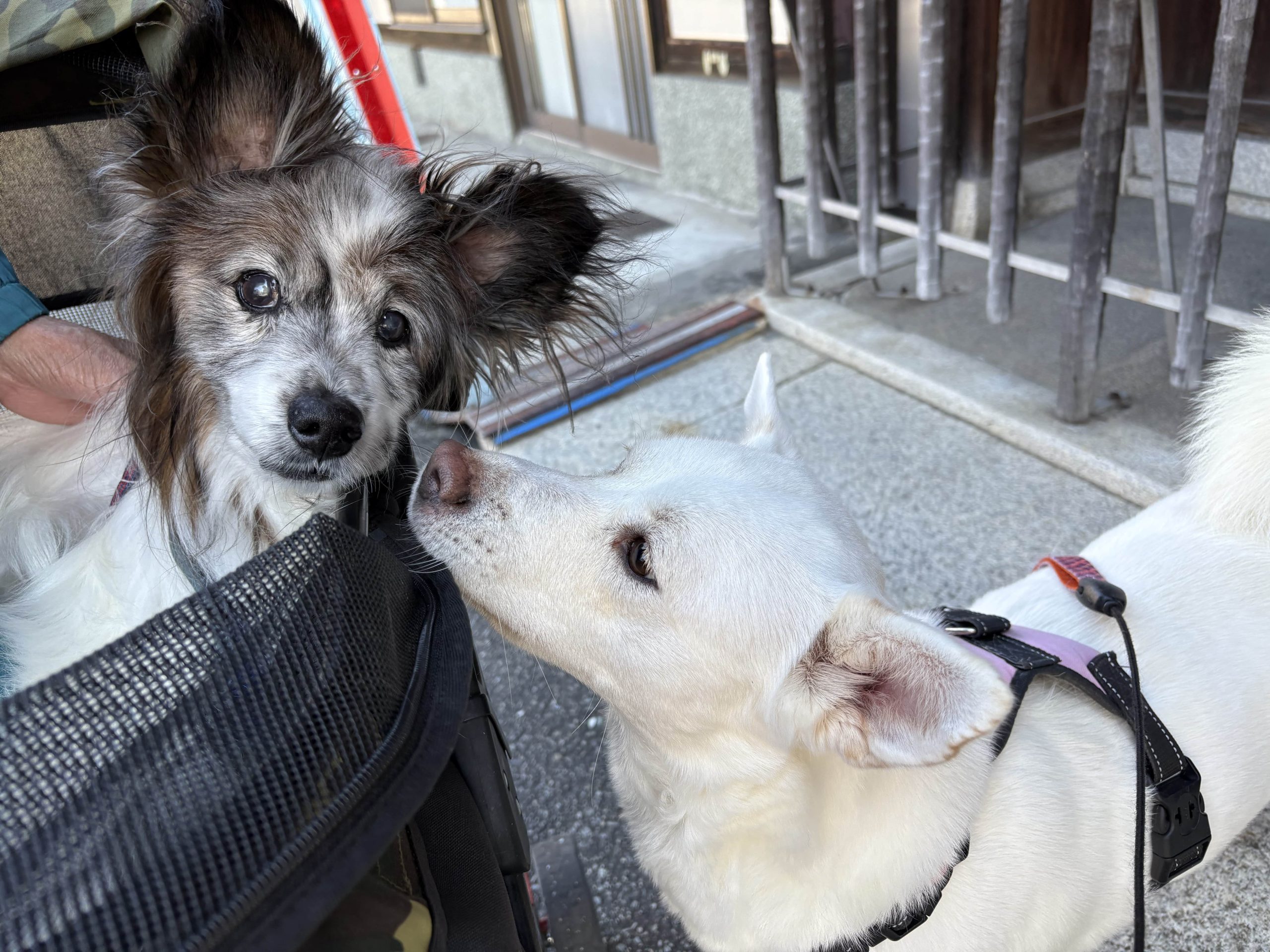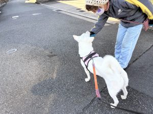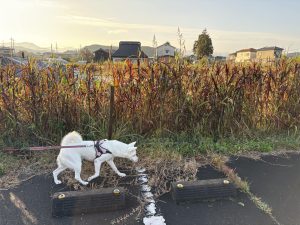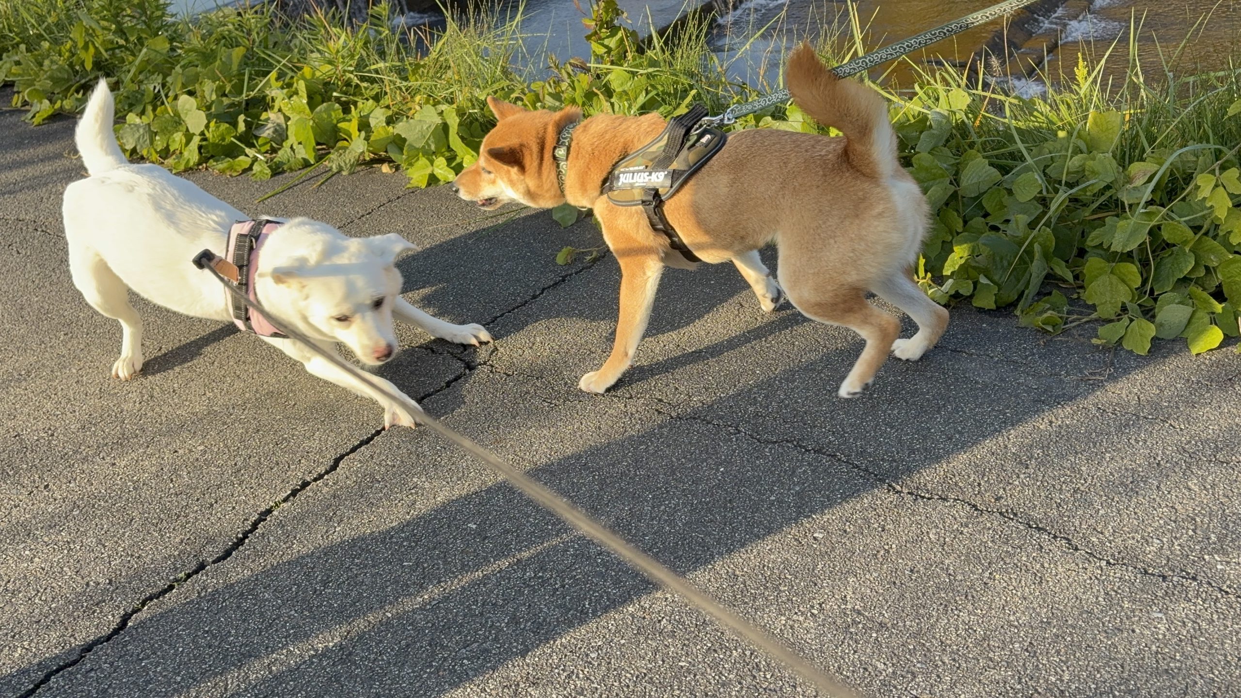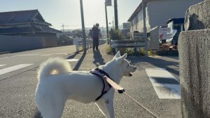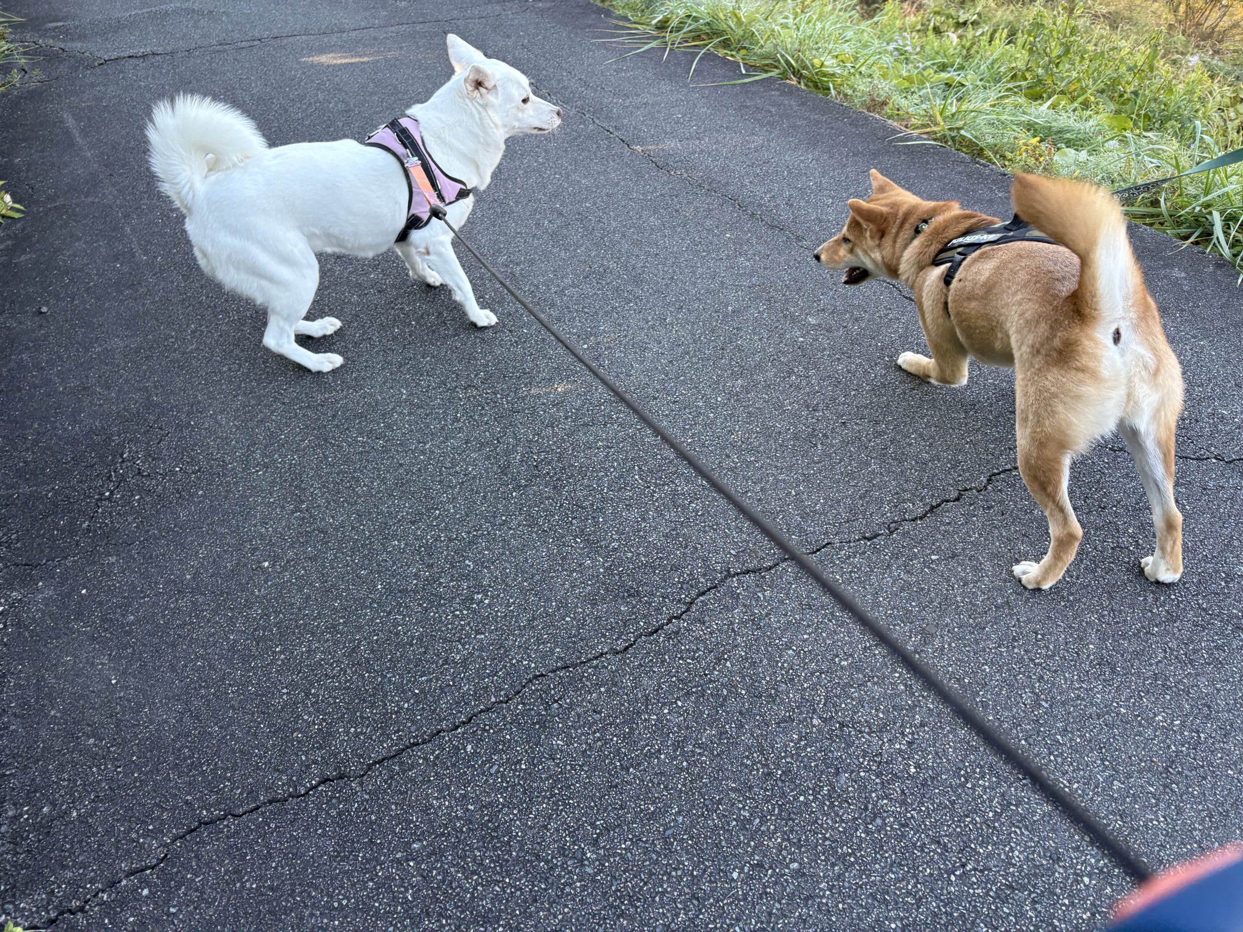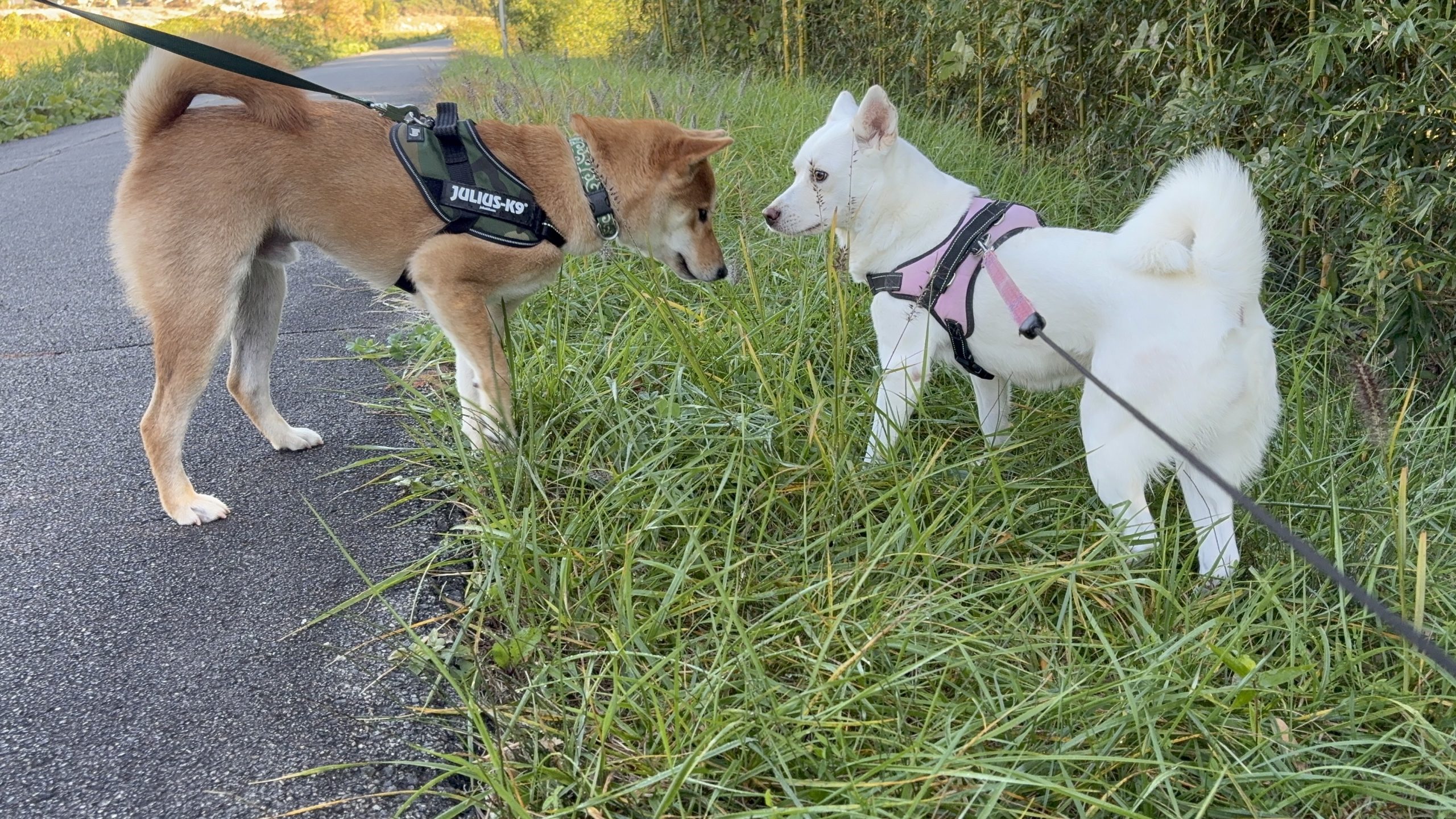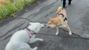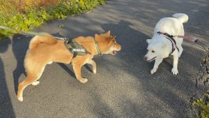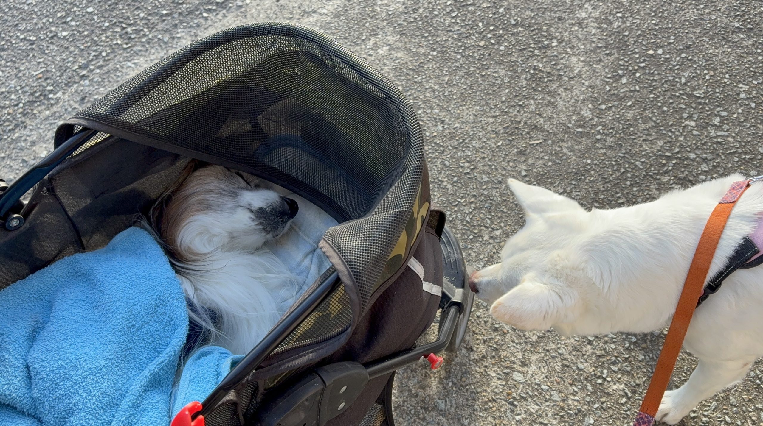 ヒラリちゃんは仕方なくお座りして、遠巻きにマルちゃんを見守りました(”◇”)ゞ