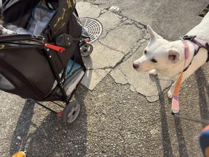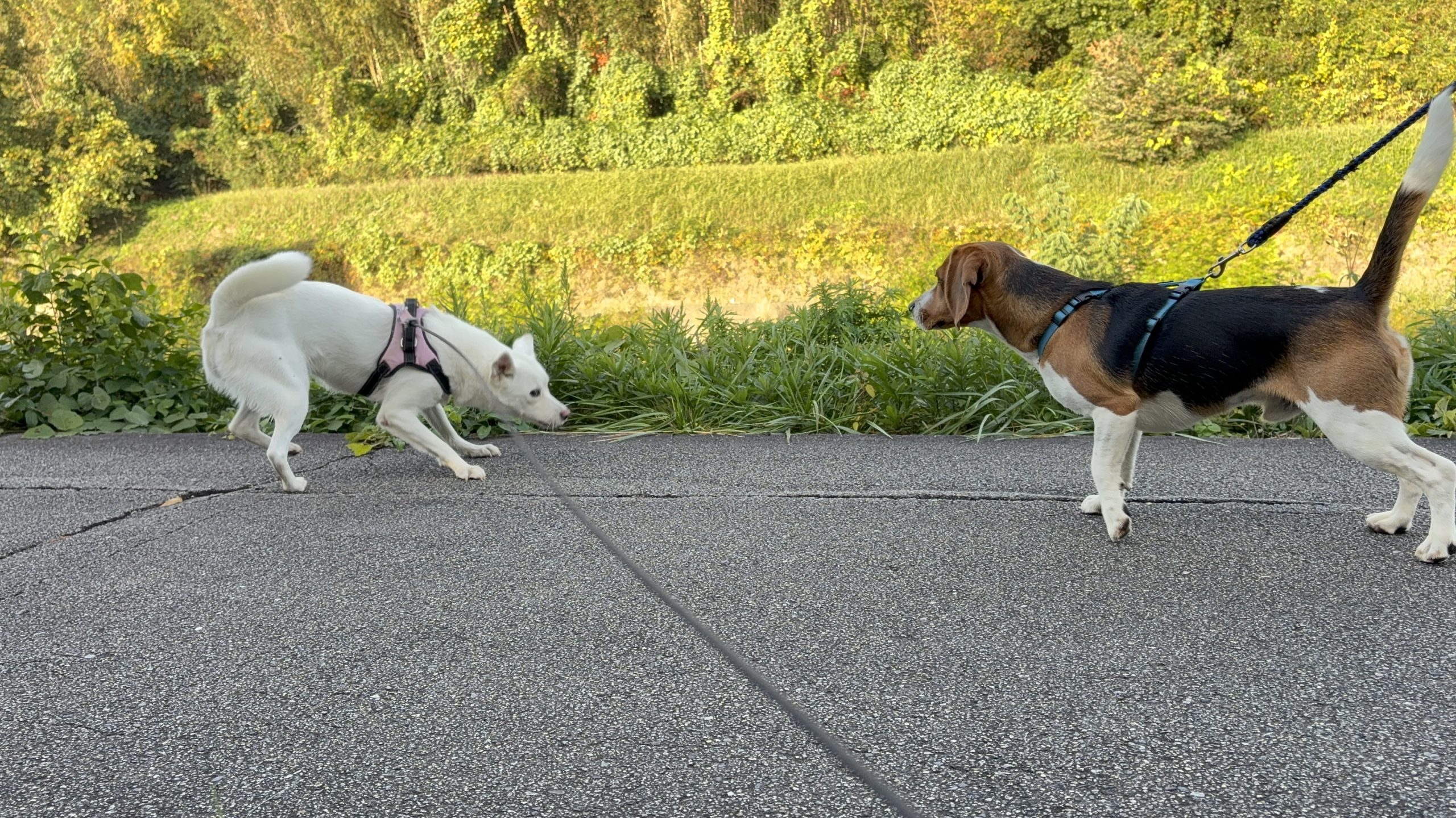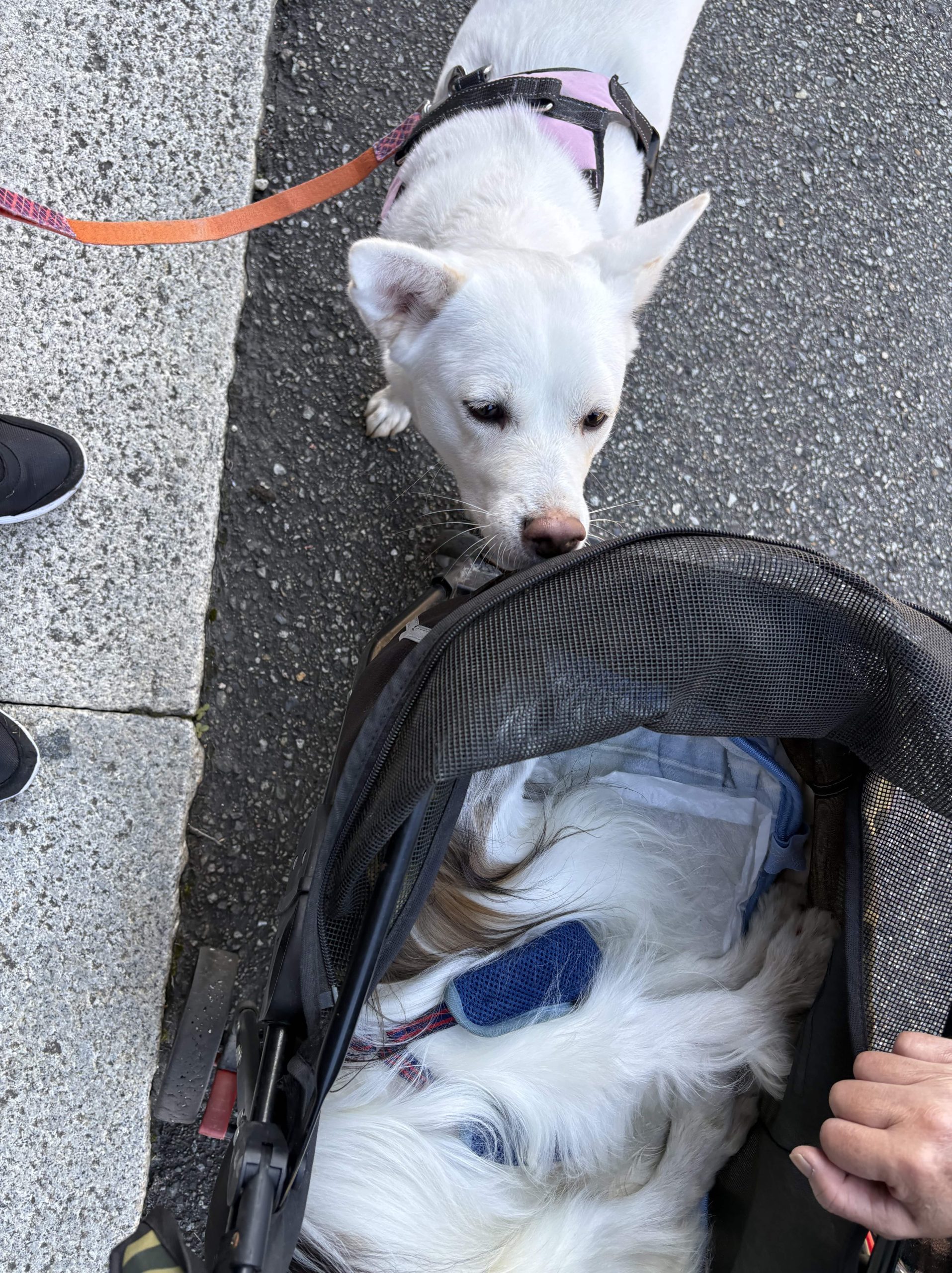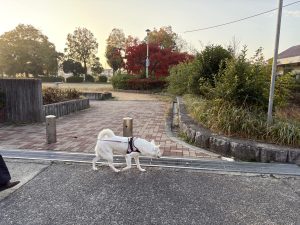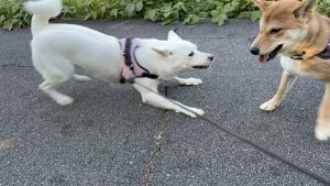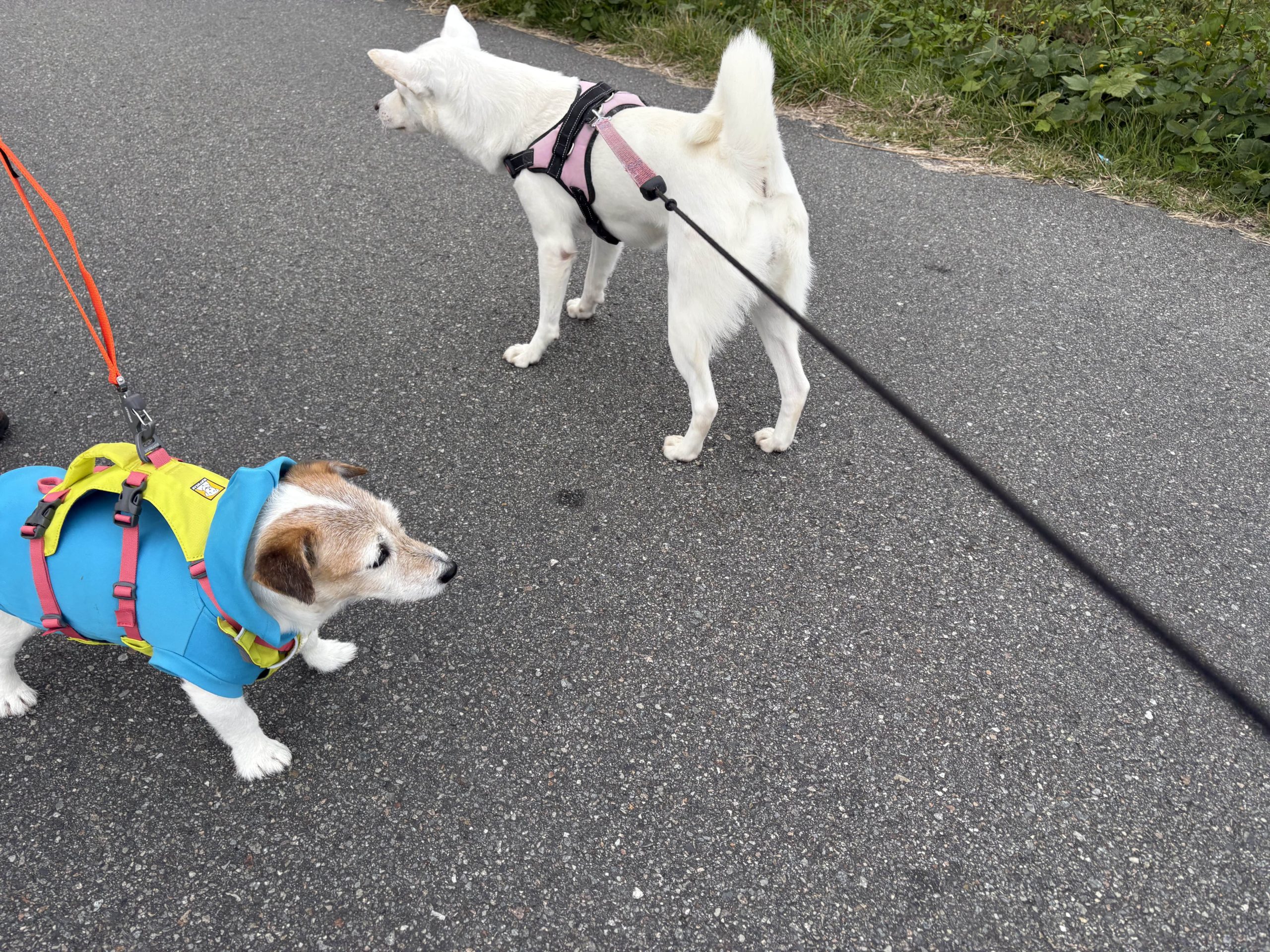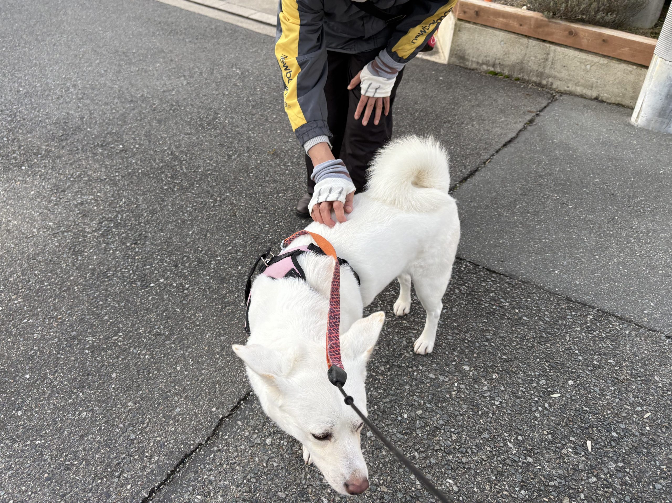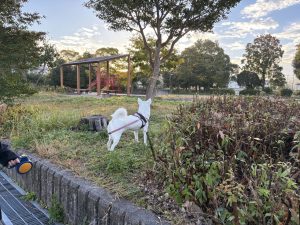 ヒラリちゃんは仕方なくお座りして、遠巻きにマルちゃんを見守りました(”◇”)ゞ
