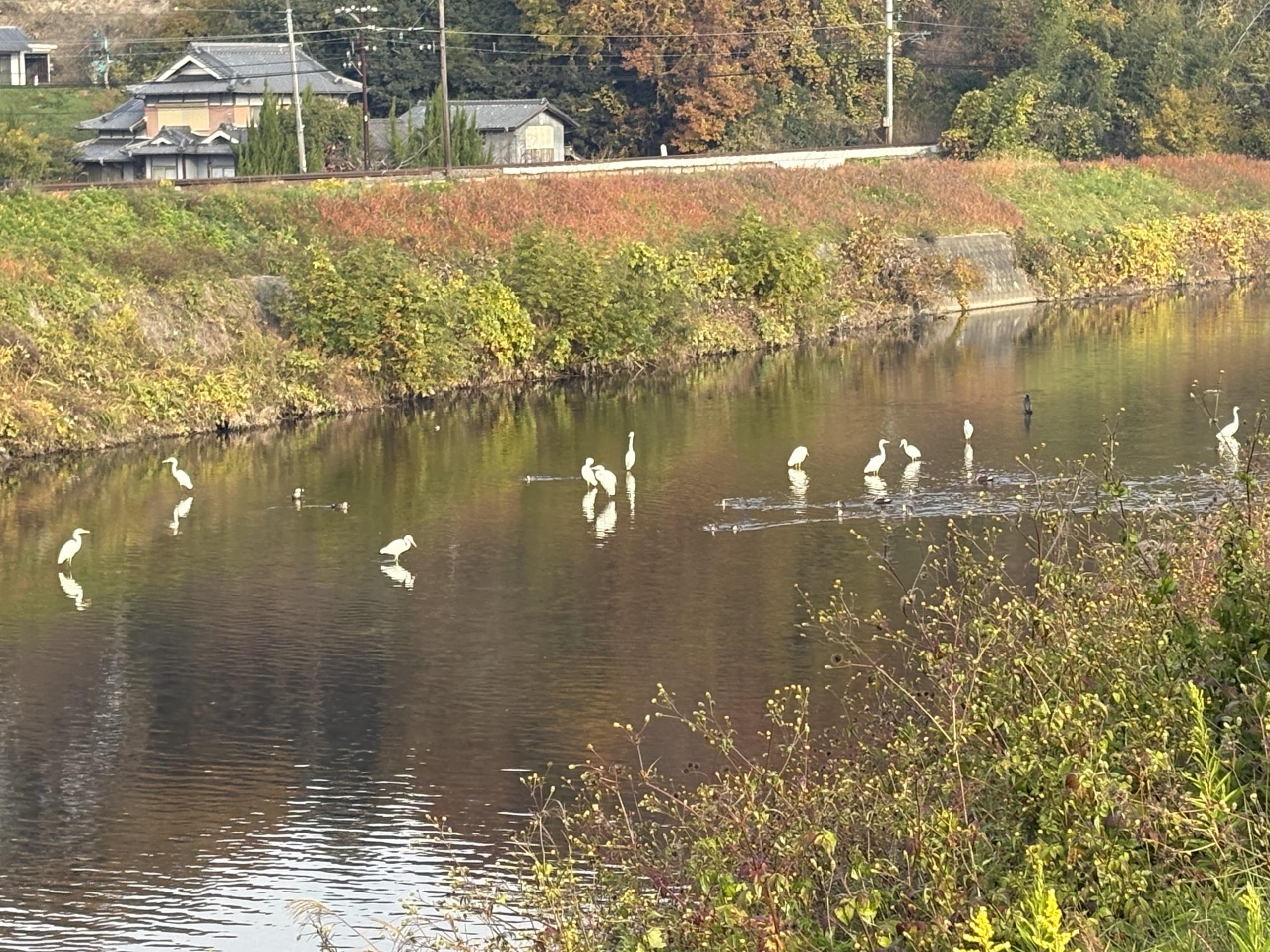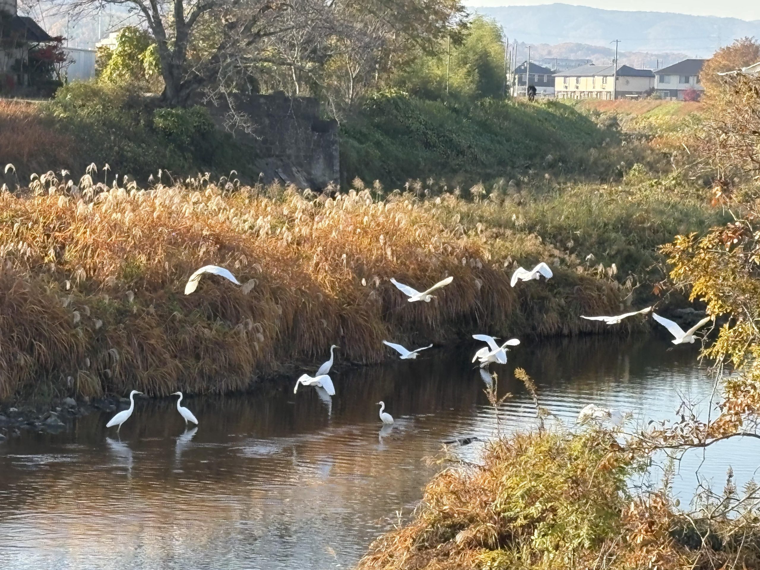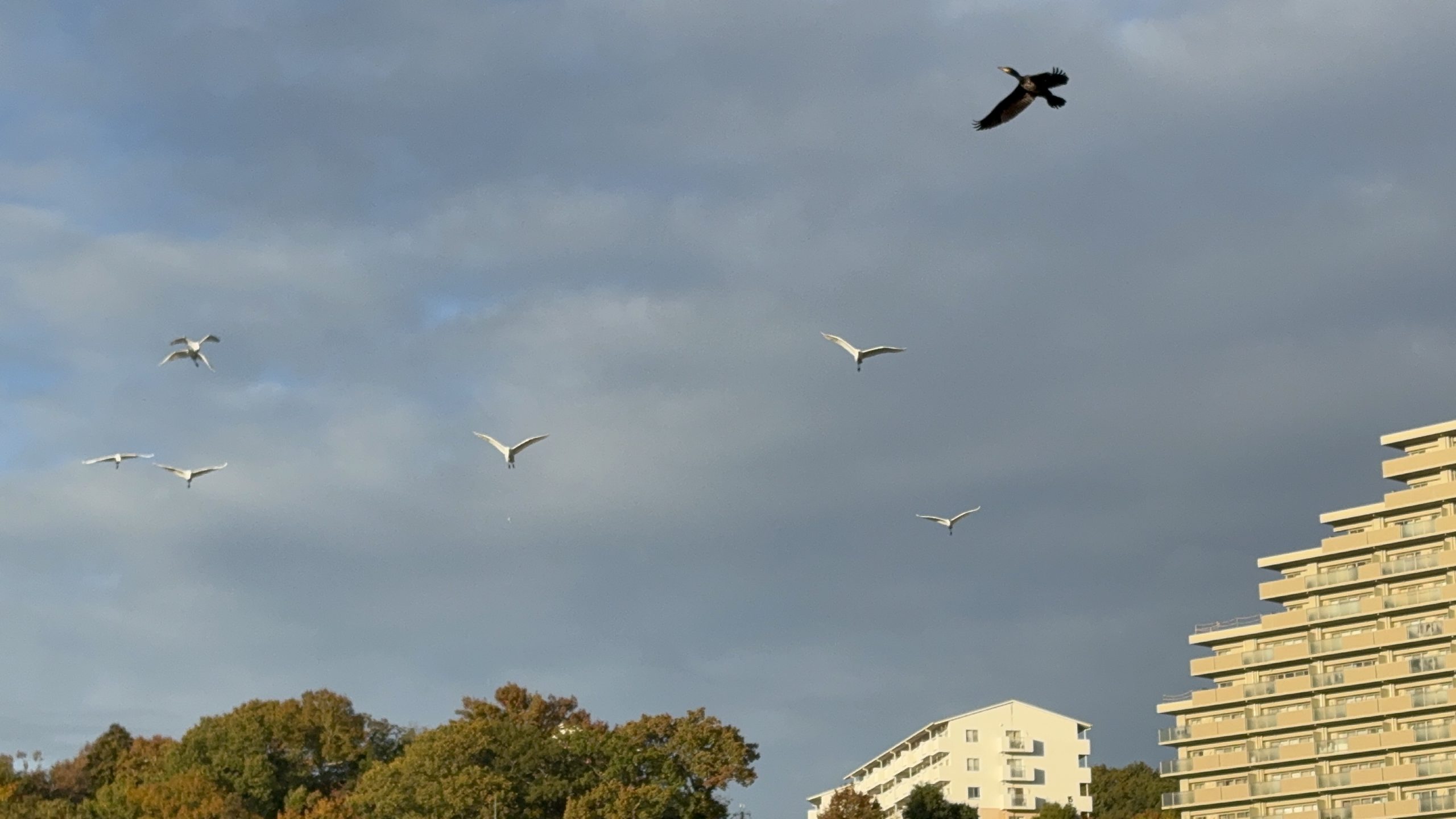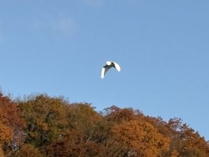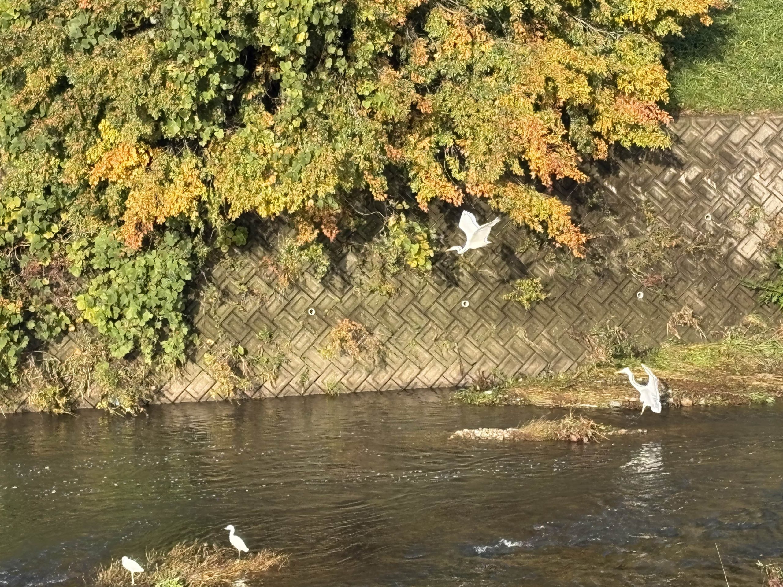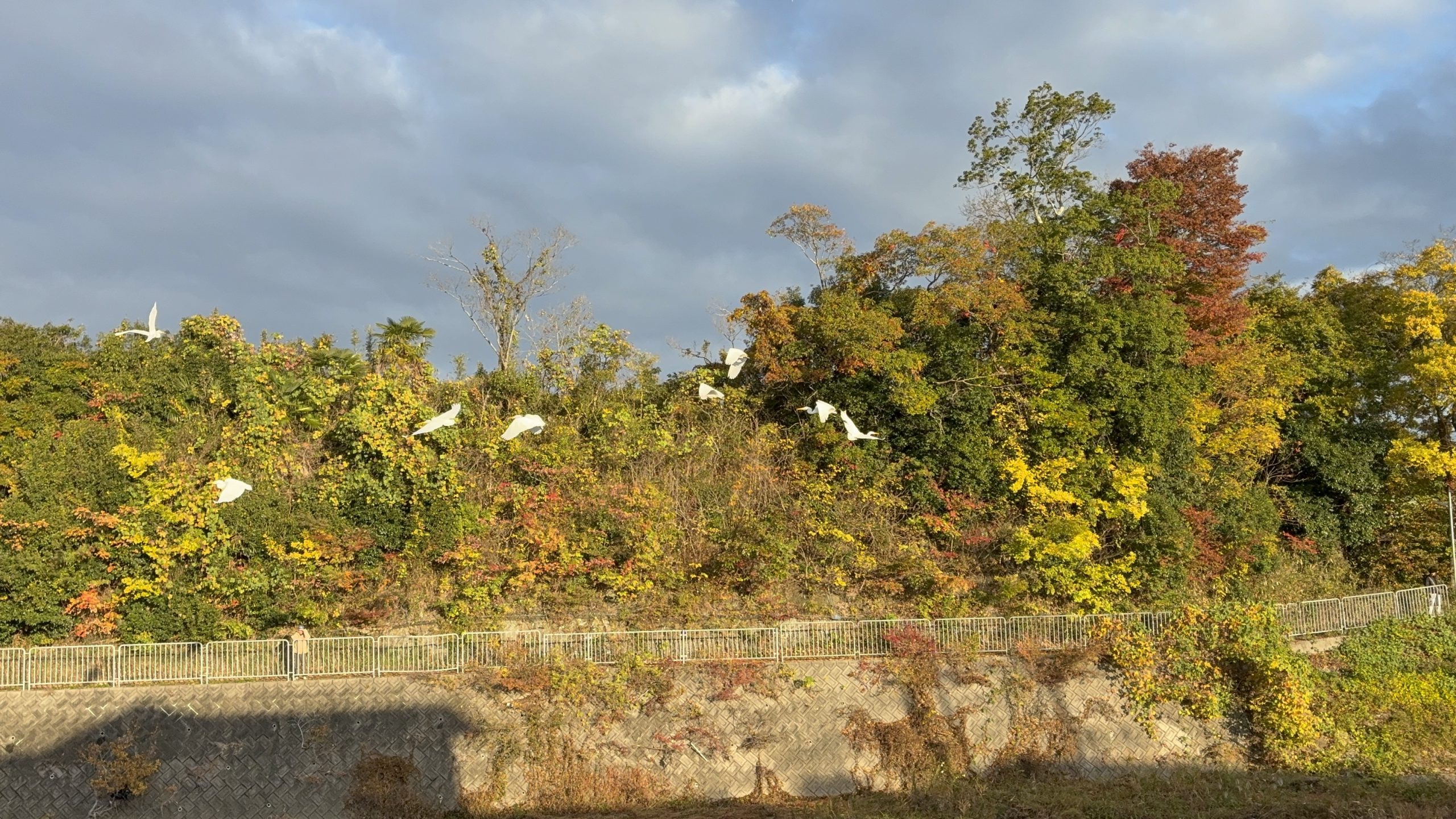 シラサギさんは 紅葉した杜の空を高く飛びました🍂