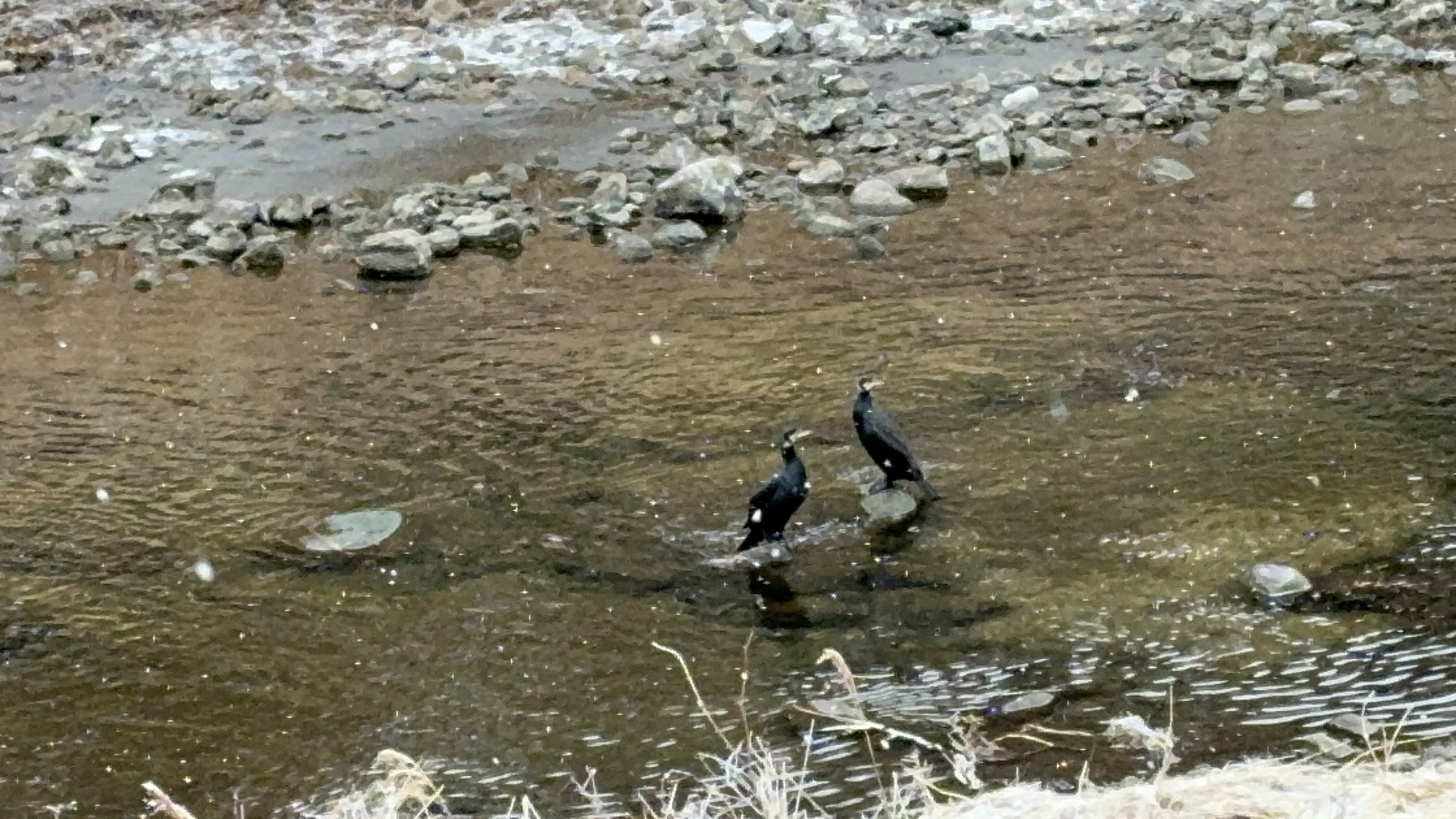 川ではシラサギさんとアオサギさんとカワウさんがトライアングルになり、
