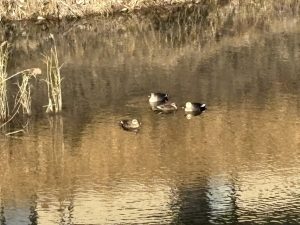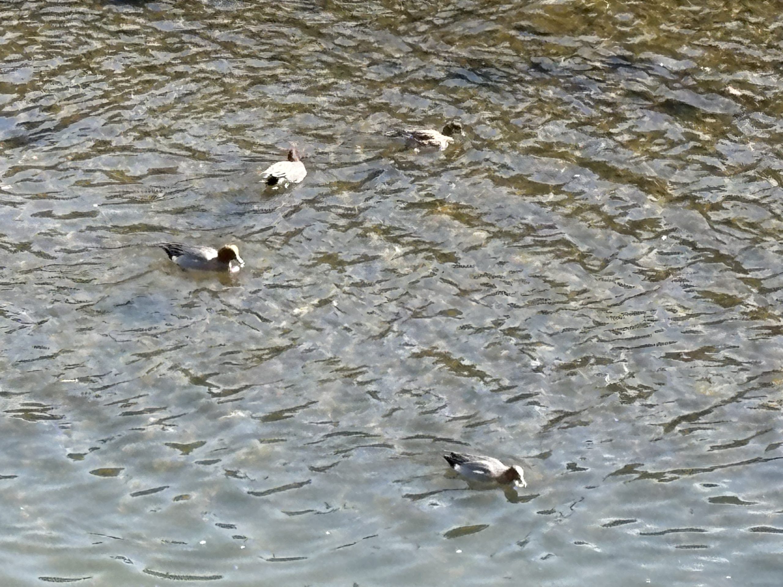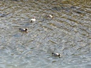 川では鴨さんが4羽 一列で泳いでいます~🦆🦆🦆🦆