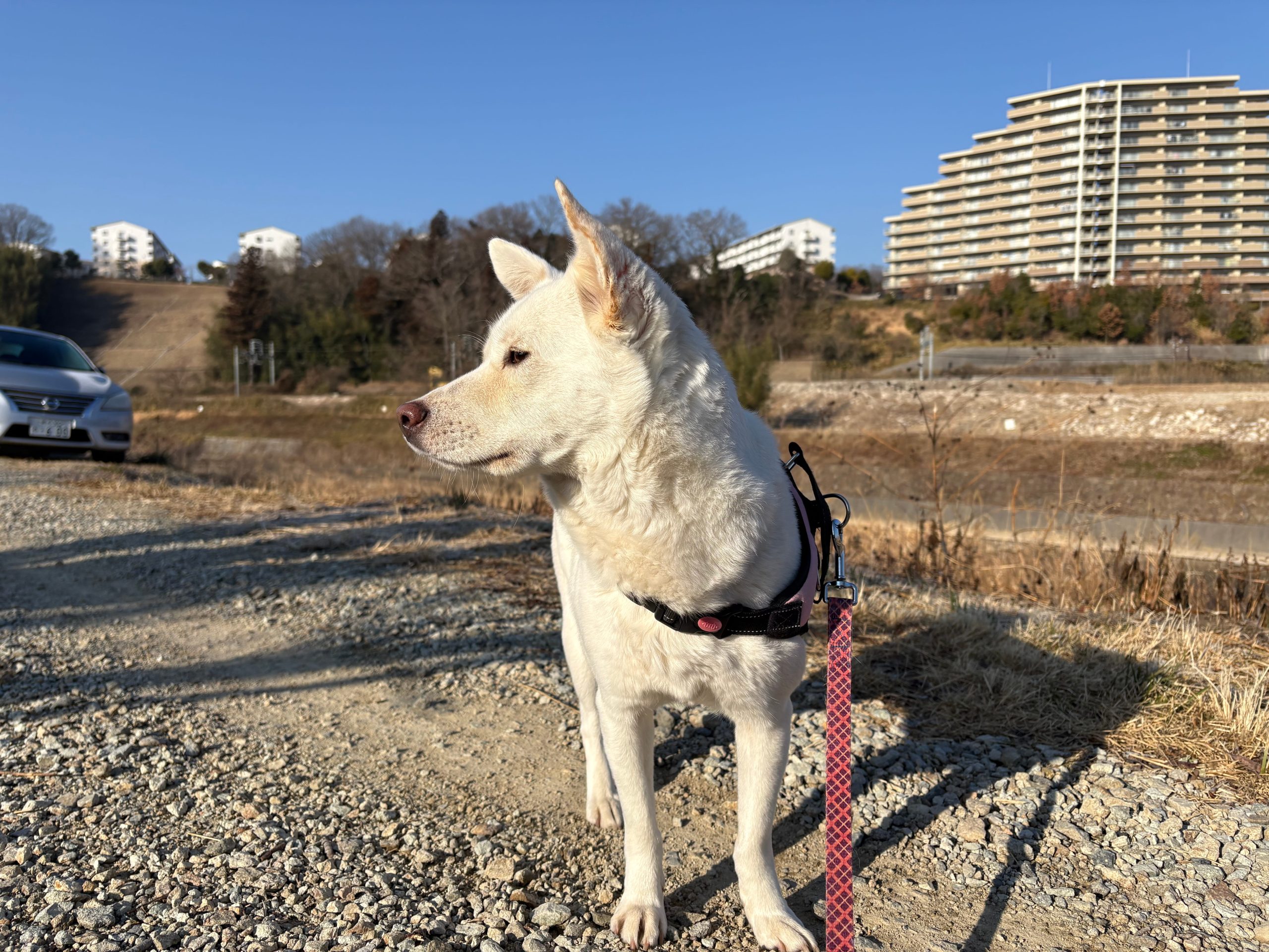 今日も 川向うを見ながら勇姿を見せるヒラリちゃん🐕