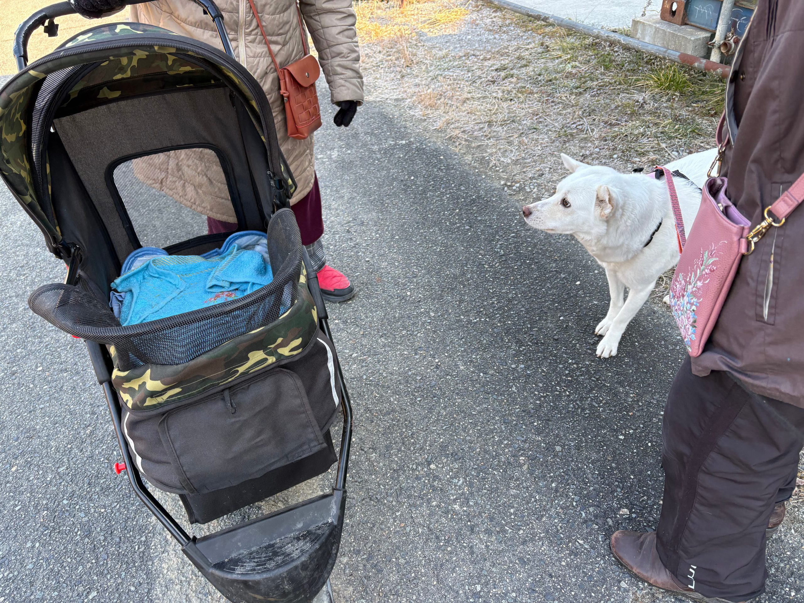 ヒラリちゃんが伸びあがってバギーをクンクンしても、もうマルちゃんは居ません。