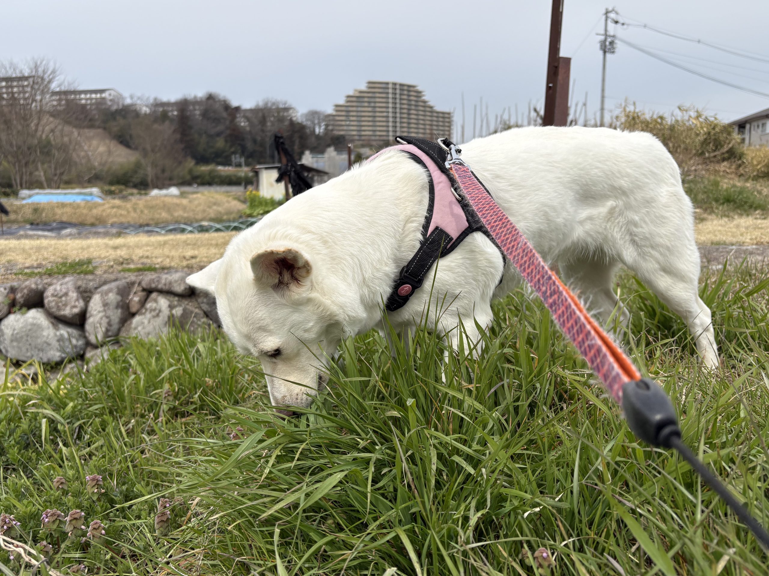 今朝もヒラリちゃんの散歩は 草を食べるところから始まります~🍃(´~`)モグモグ