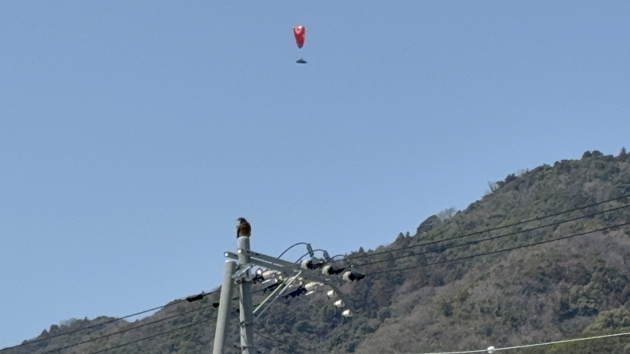 高速道路が通る山の上から 浜に降りるパラグライダー🪂