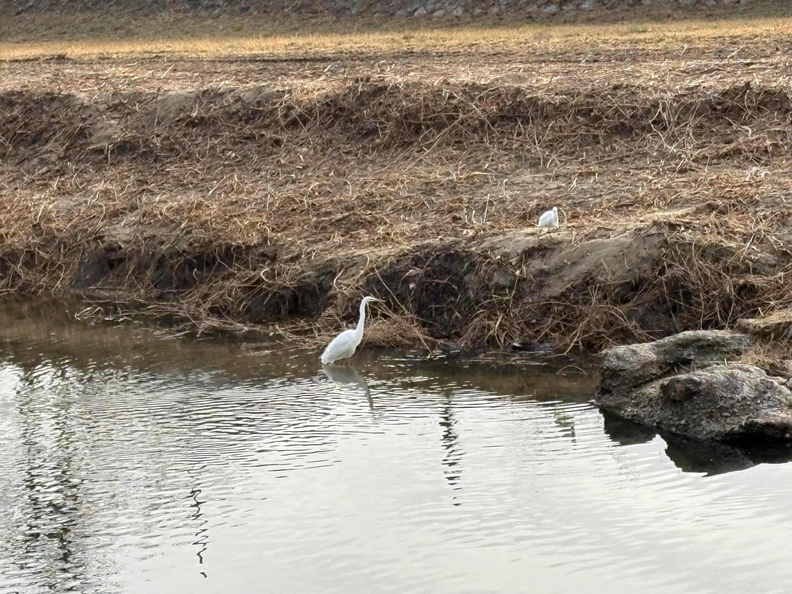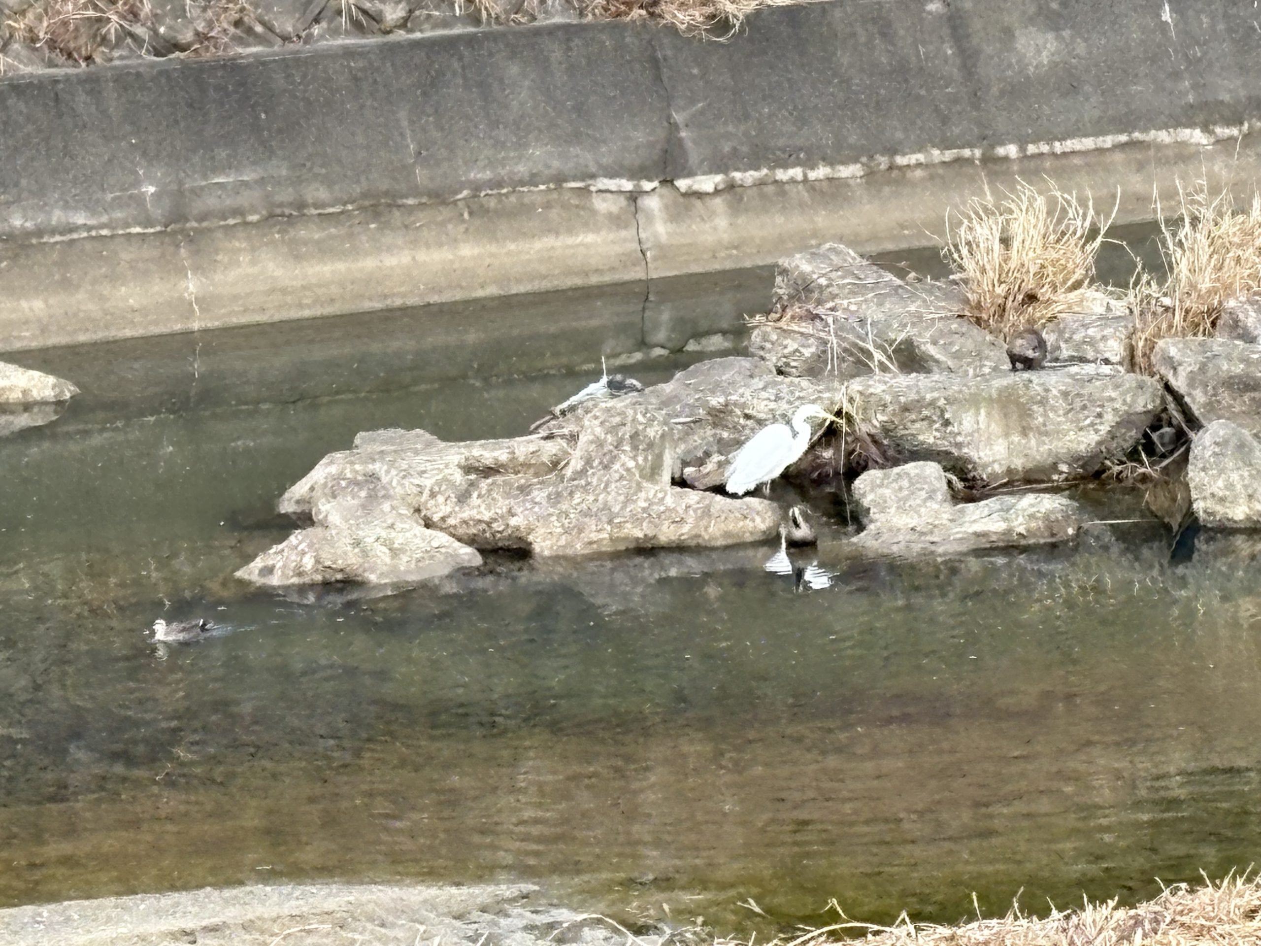 シラサギのおかあさんは、その後も鴨さん二羽の面倒を見ていました🦆