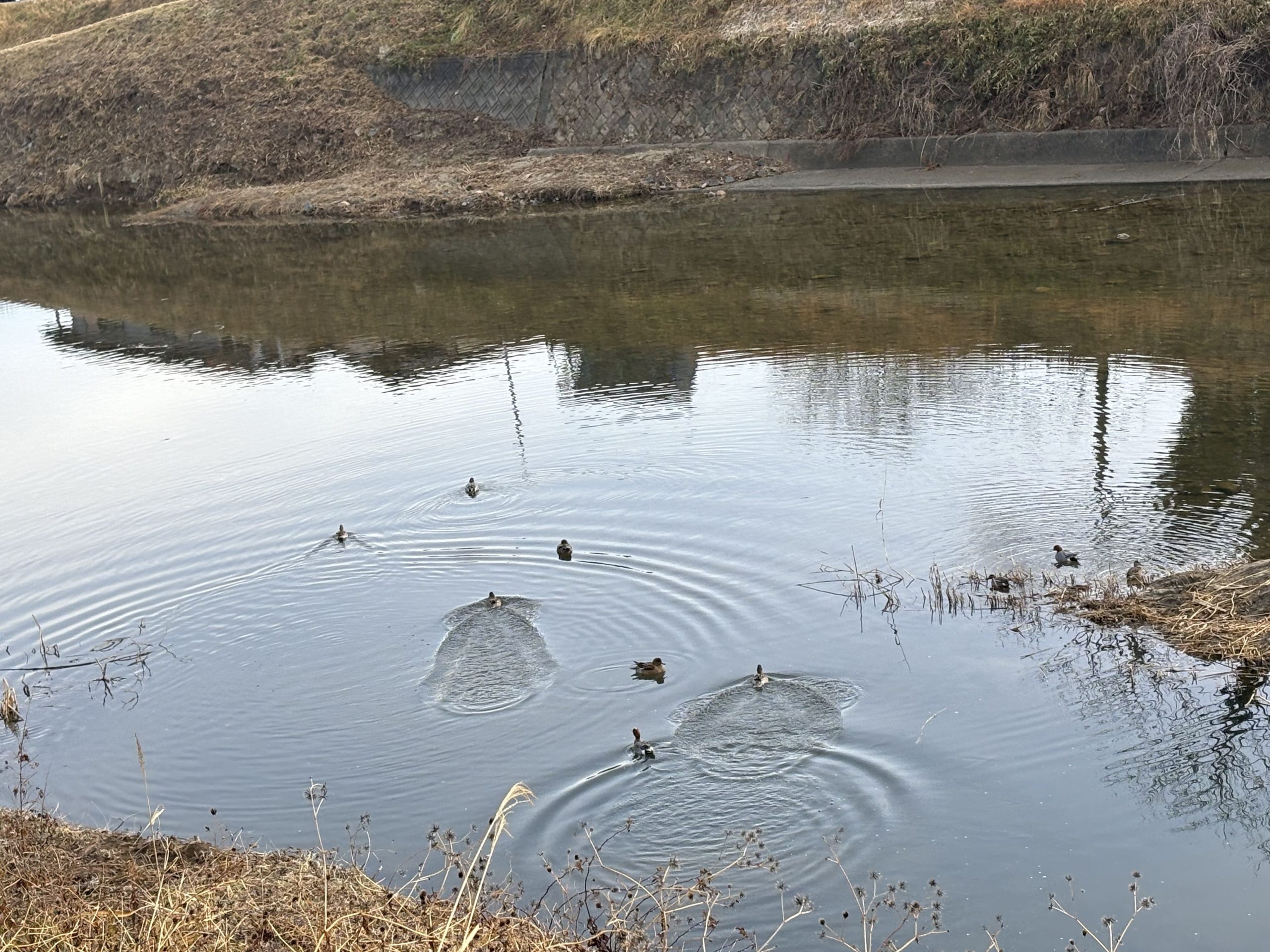 朝のお散歩。川には8羽の鴨さんたち(^^)