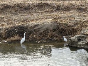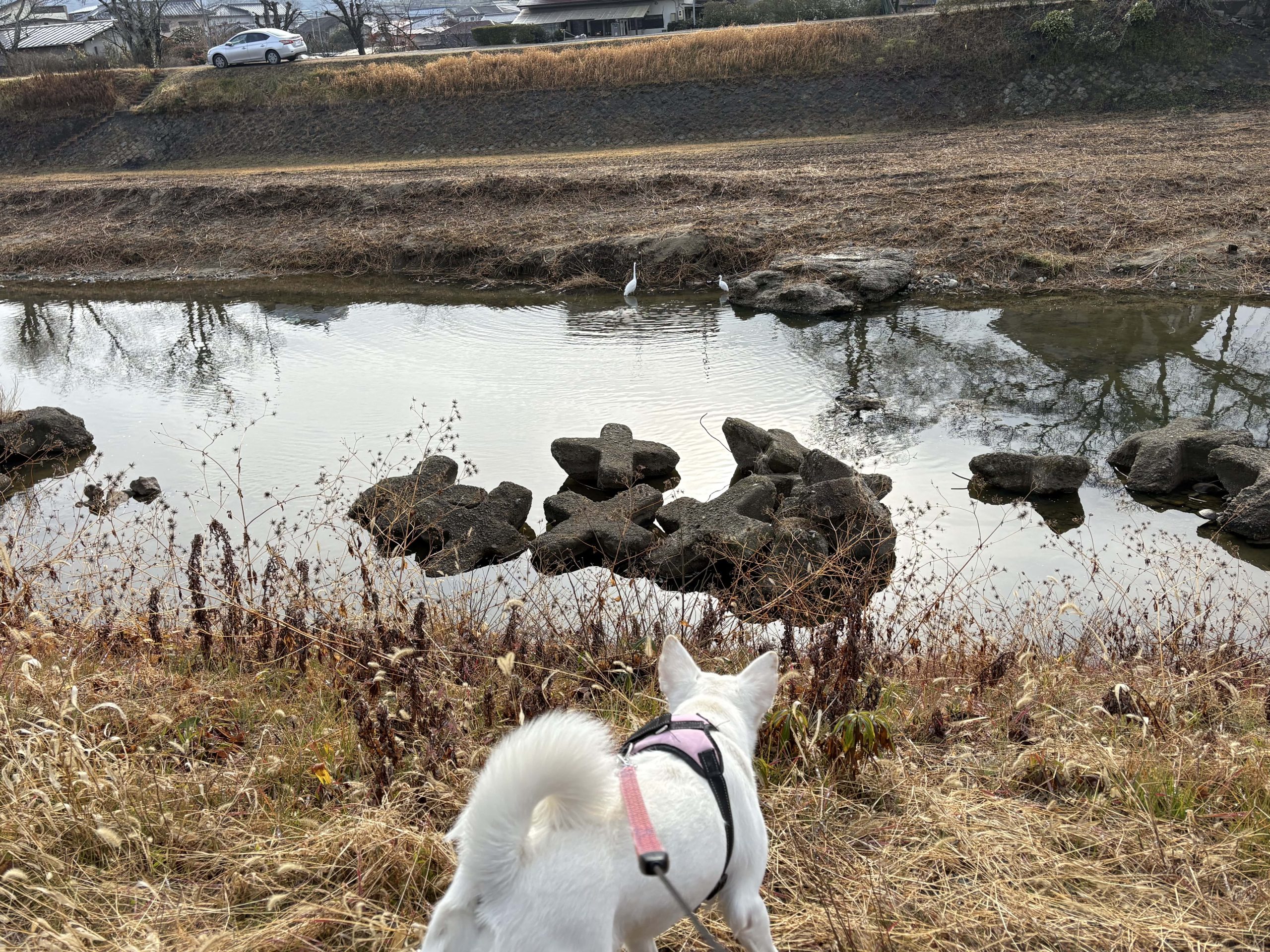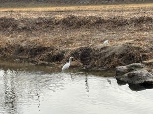 シラサギのおかあさんは、こどもが河川敷の土手に上がったので、