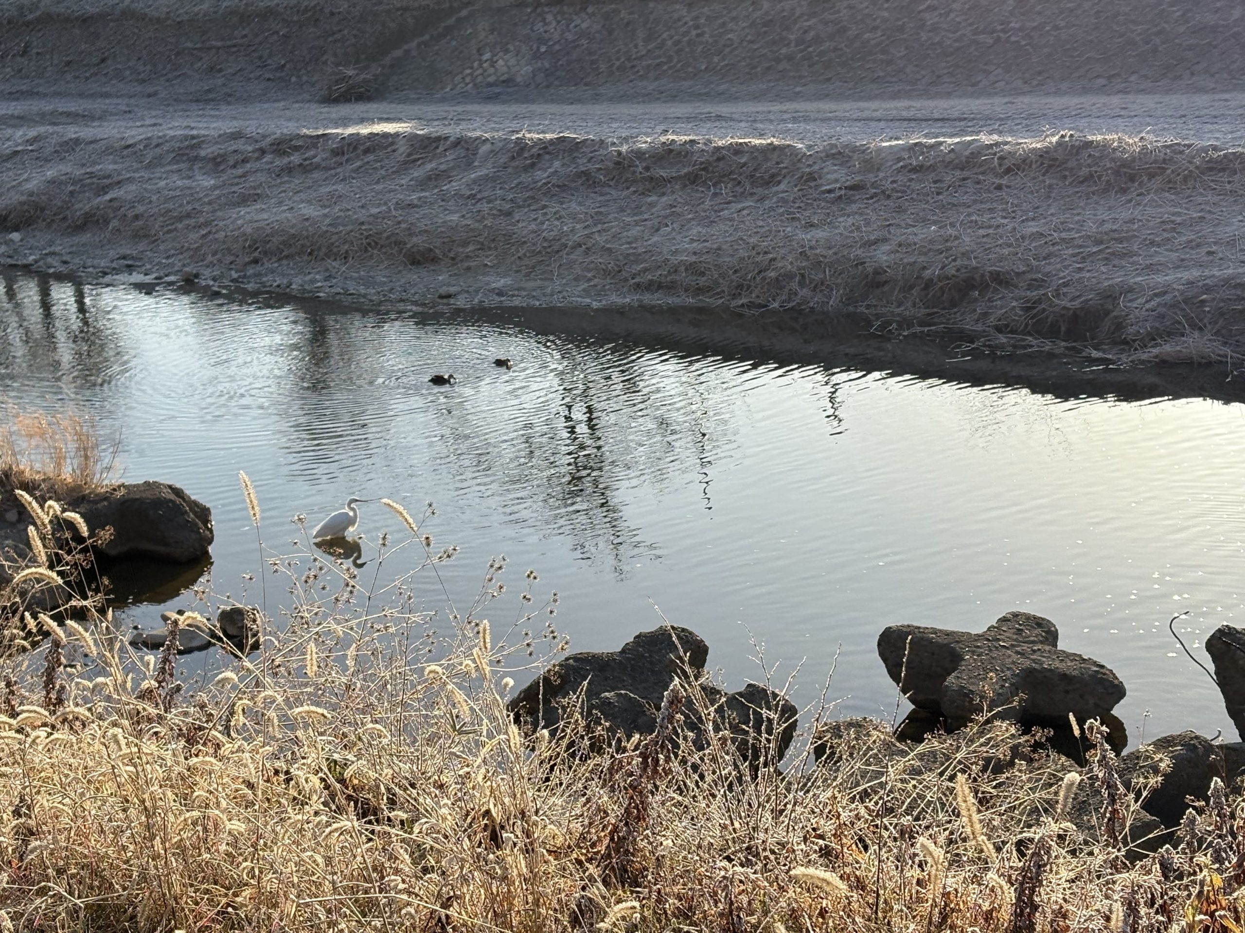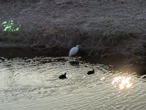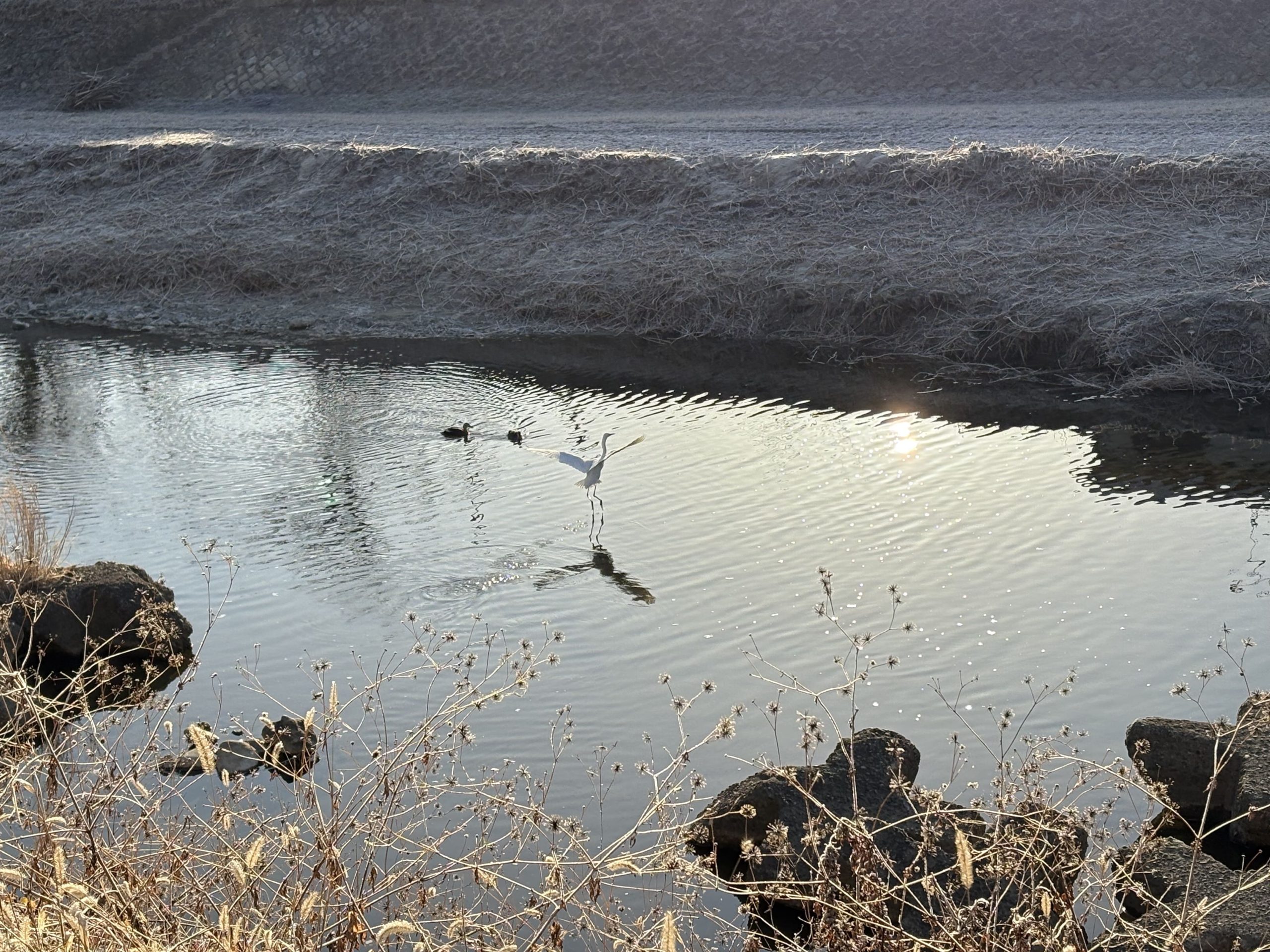 川ではシラサギおかあさんが、鴨さん二羽を見守っています(*´ω`)