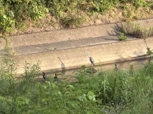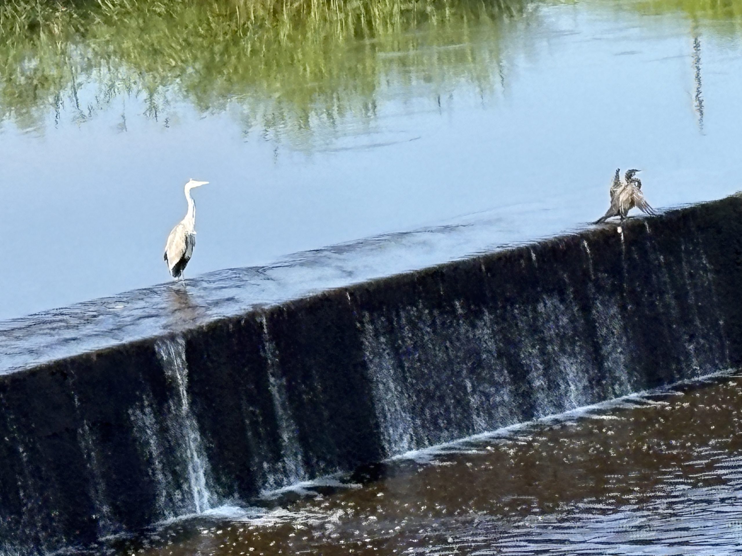 川ではアオサギさんと お供のカワウさんが3羽~Σ(・ω・ノ)ノ!
