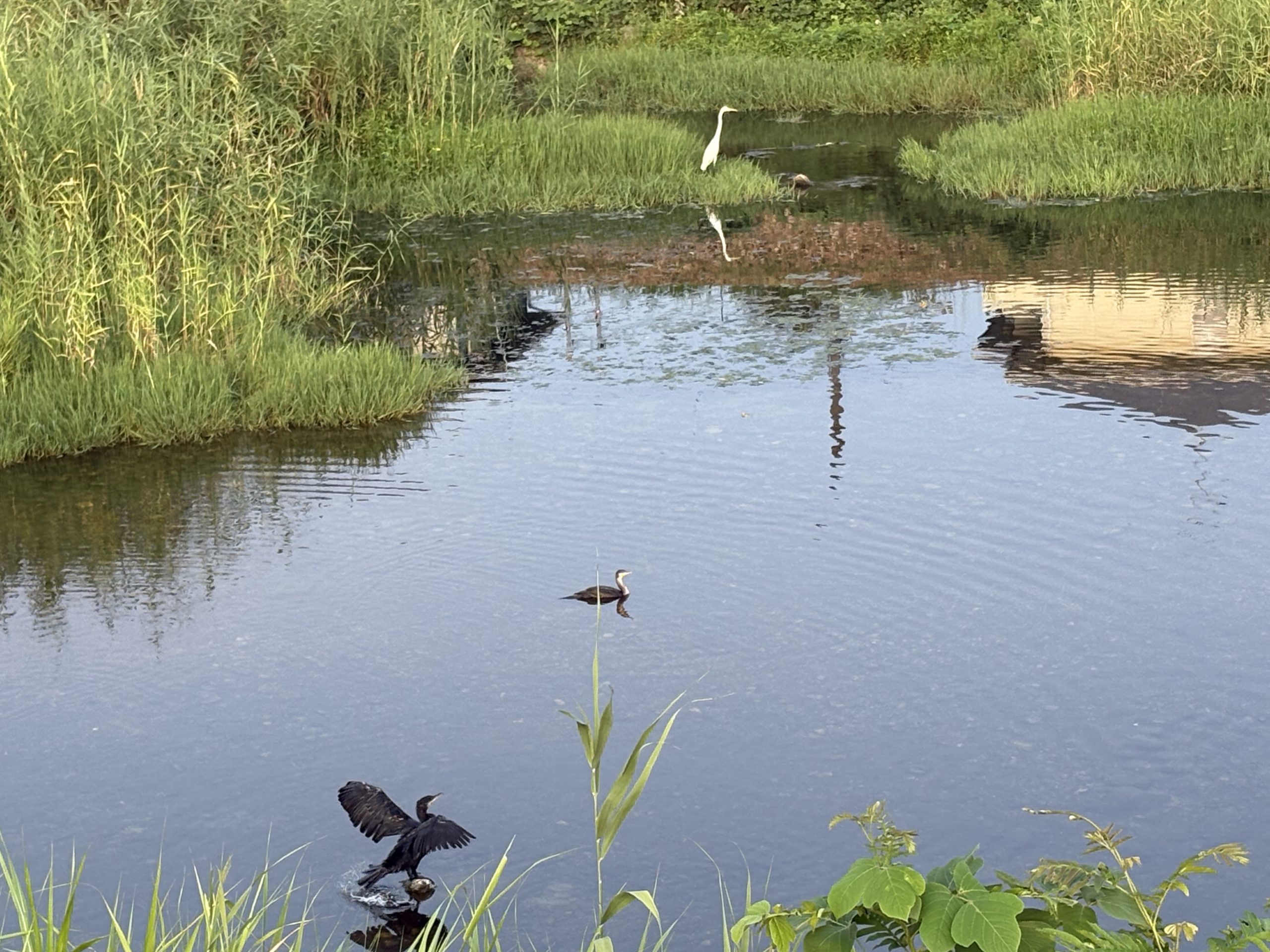川ではシラサギさん カワウさん 鴨さん🦆 揃っての3ショットです~📹