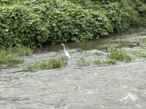 濁流の中でも いつものようにスッキリと立つシラサギさん(^^)