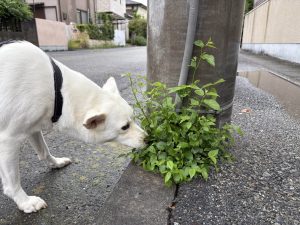 電柱の傍に映えるヒラリちゃんの好きな🍃(´~`)モグモグ