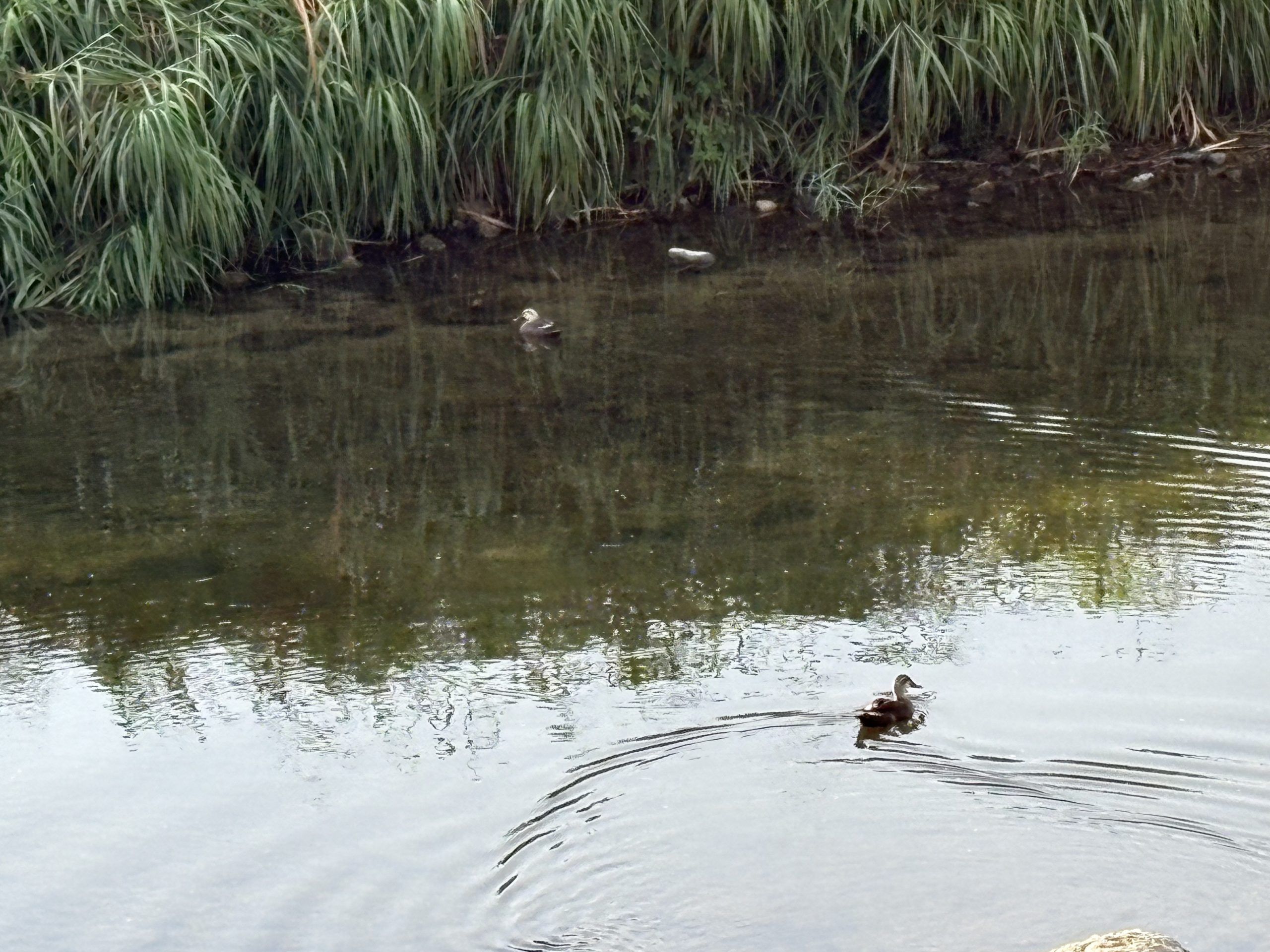 川には二羽の鴨さん。少し離れたおかあさんの方は