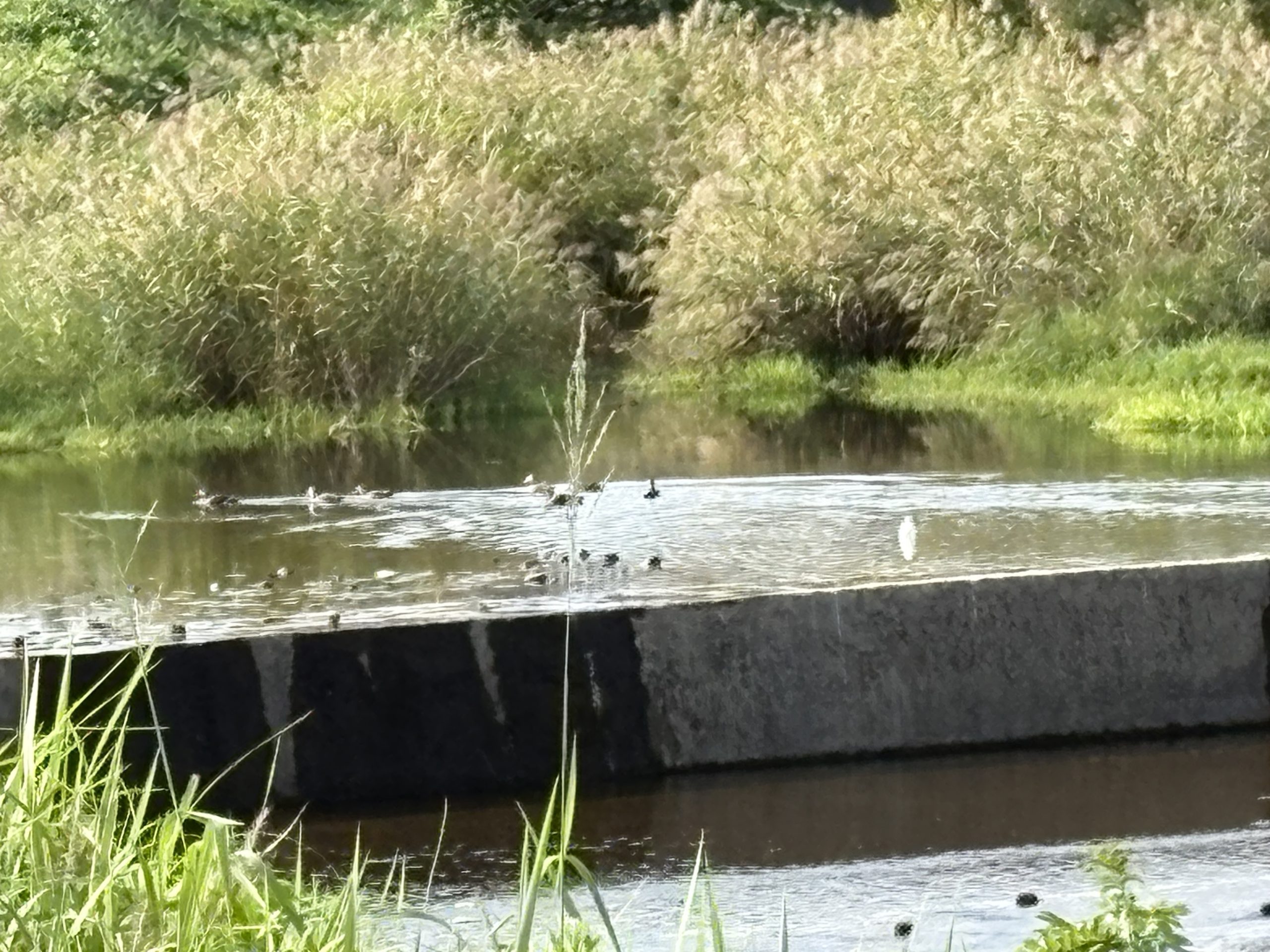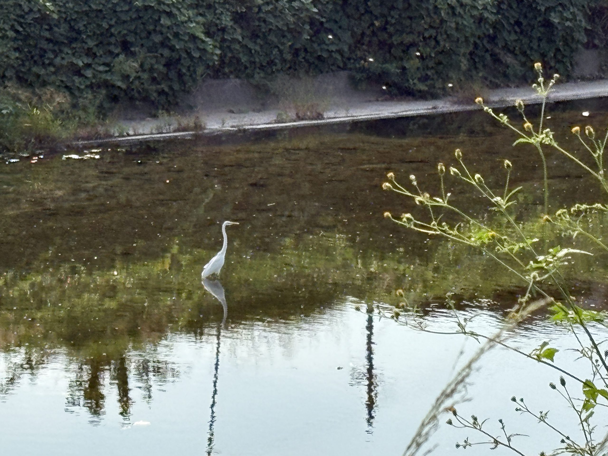 川では、シラサギさんと大勢の鴨さんの集まりです~🦆🦆🦆🦆🦆🦆