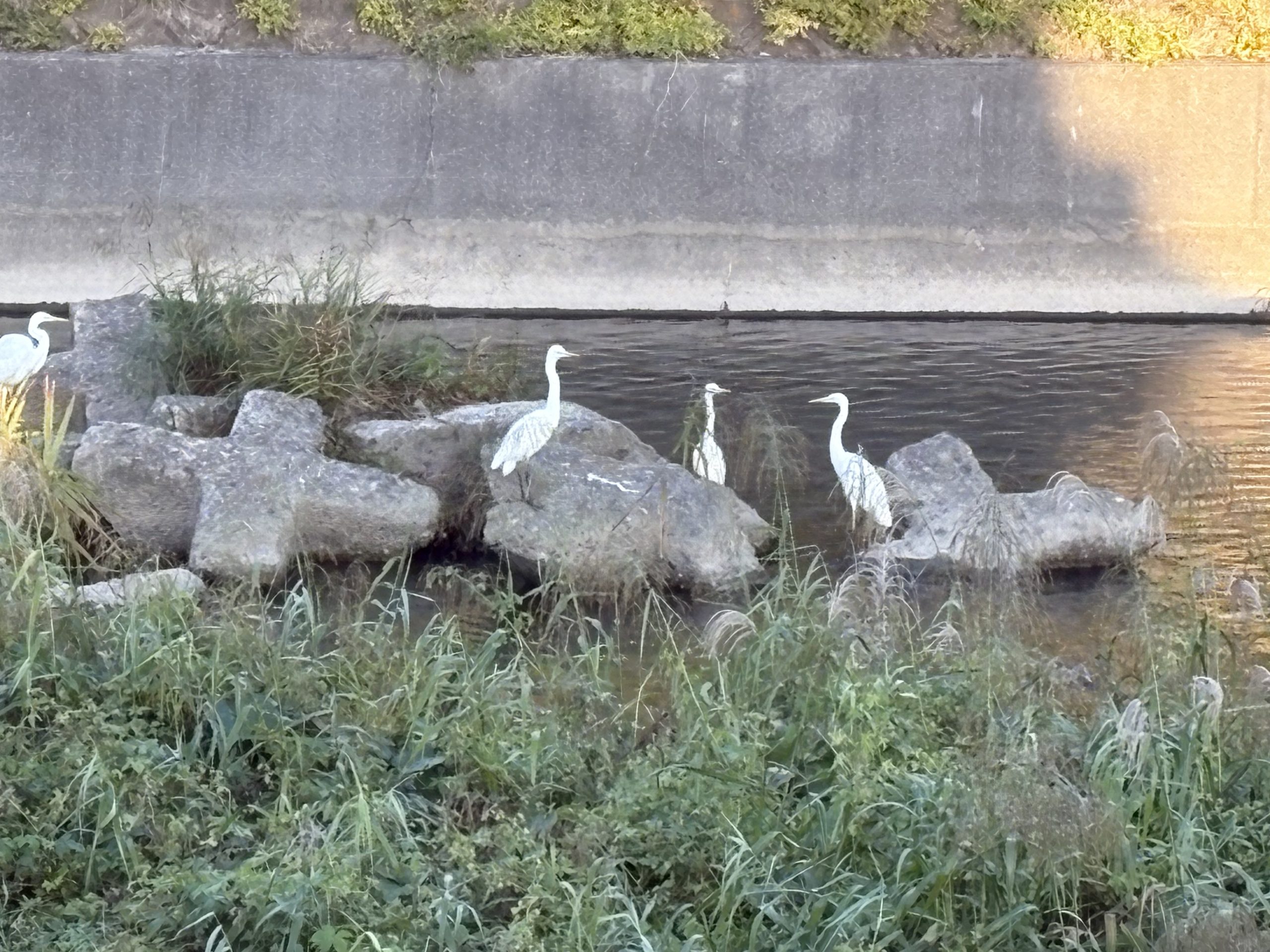 テトラポットの上で座談会をしている4羽のシラサギさん(*’▽’)