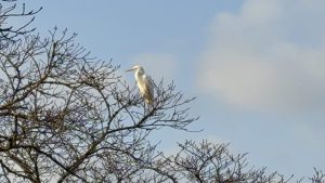 裸樹になっている桜の枝のてっぺんに、シラサギさんが留まっていましたΣ(・ω・ノ)ノ!