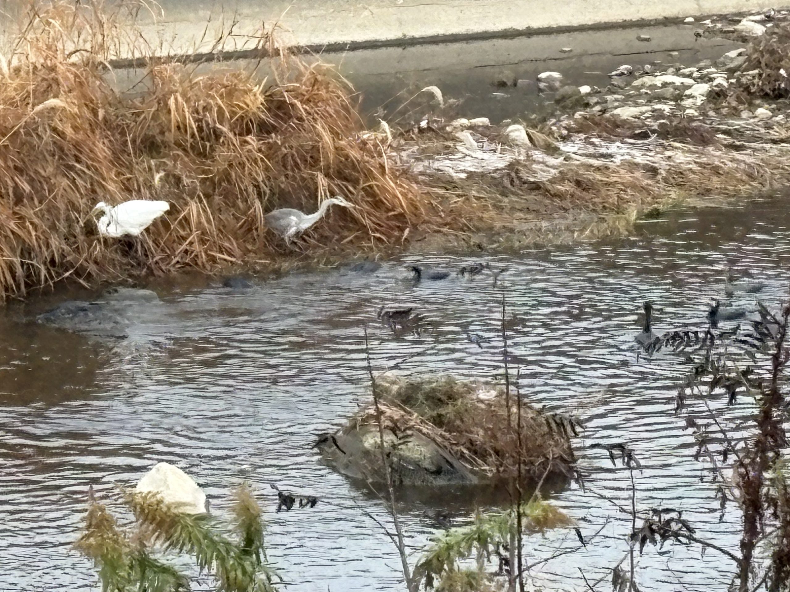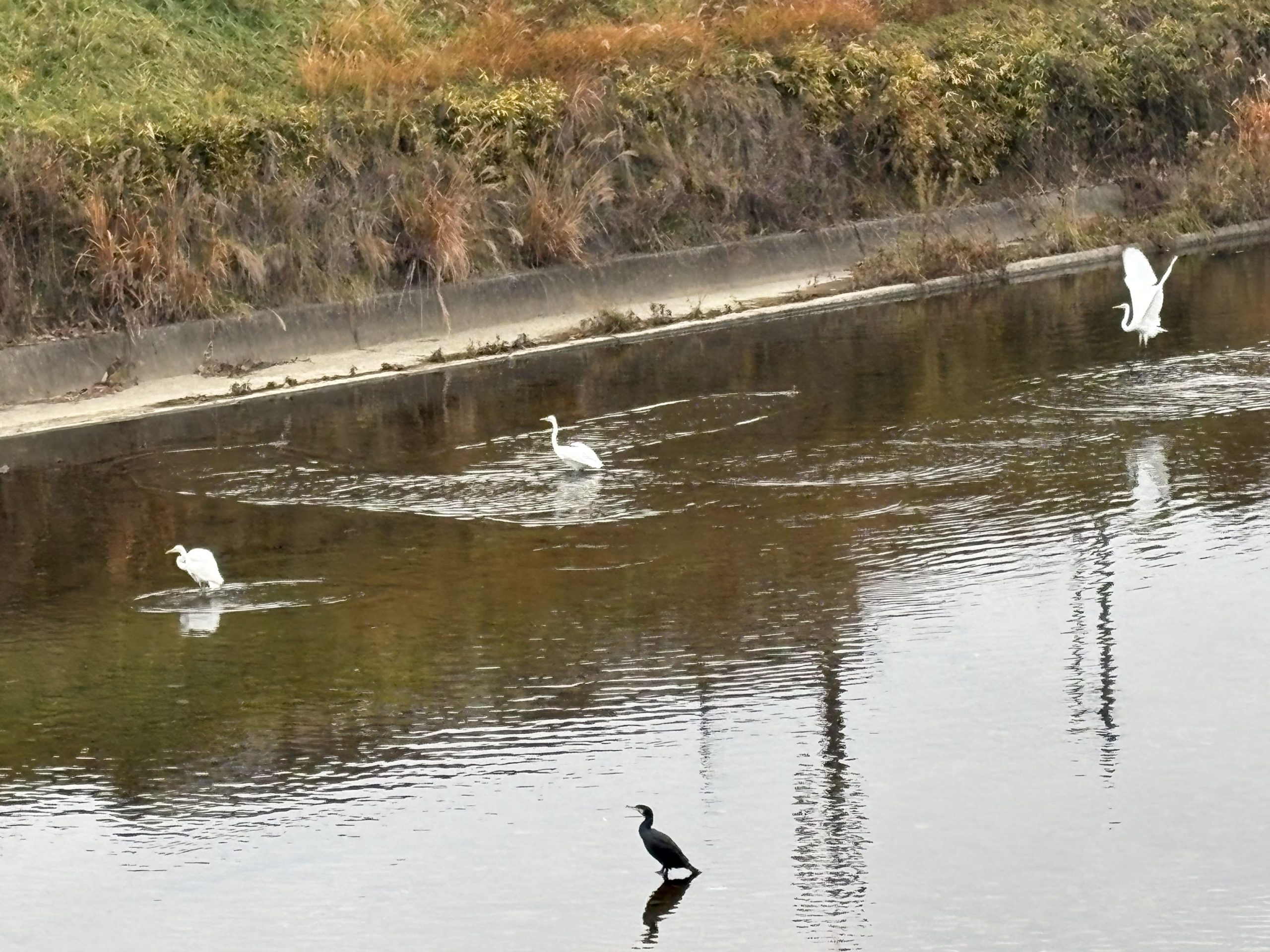 少し離れた上流では 3羽のシラサギさんと1羽のカワウさんです~(*’’▽’’)