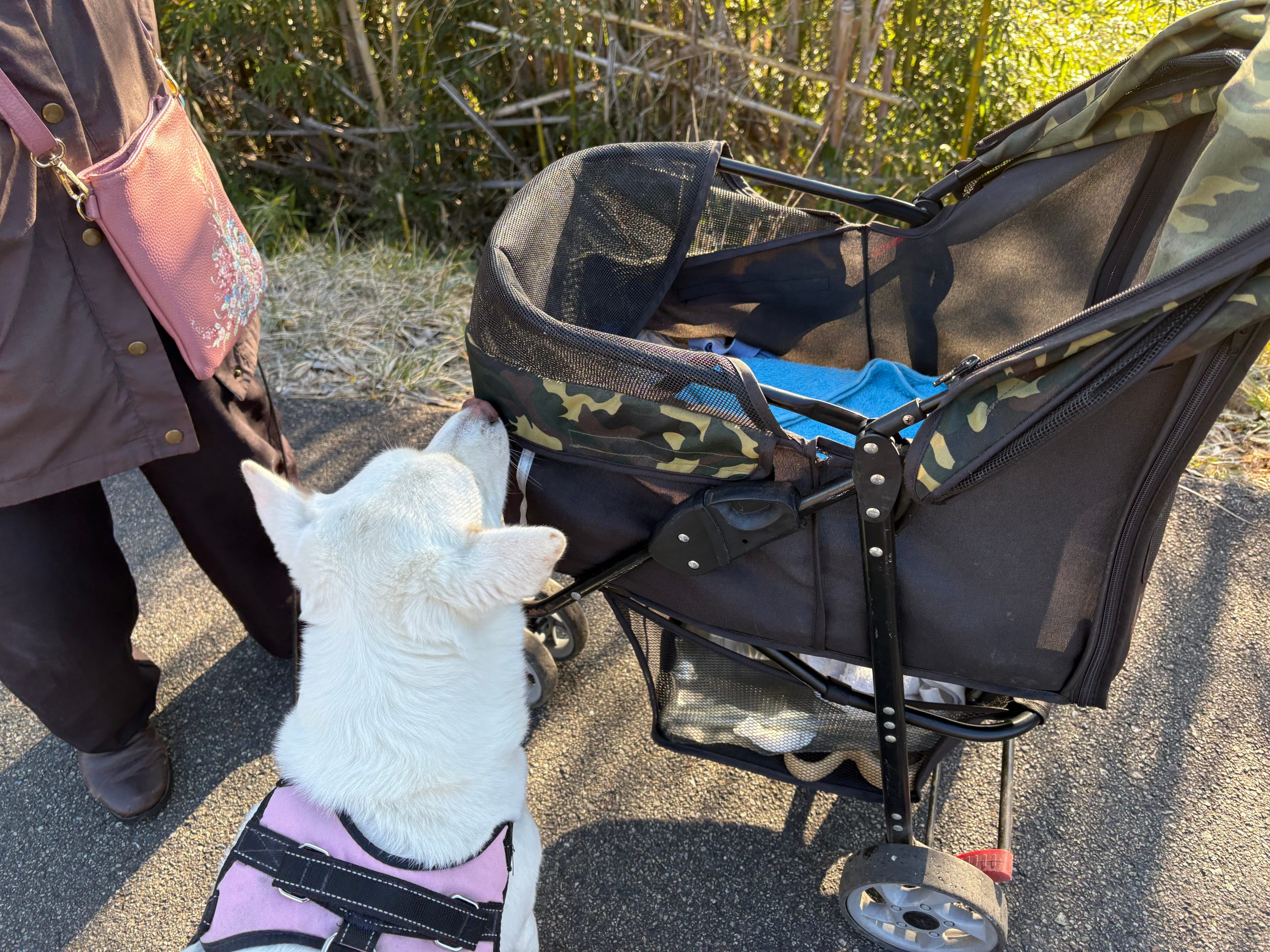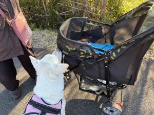 ヒラリちゃんが伸びあがってバギーをクンクンしても、もうマルちゃんは居ません。
