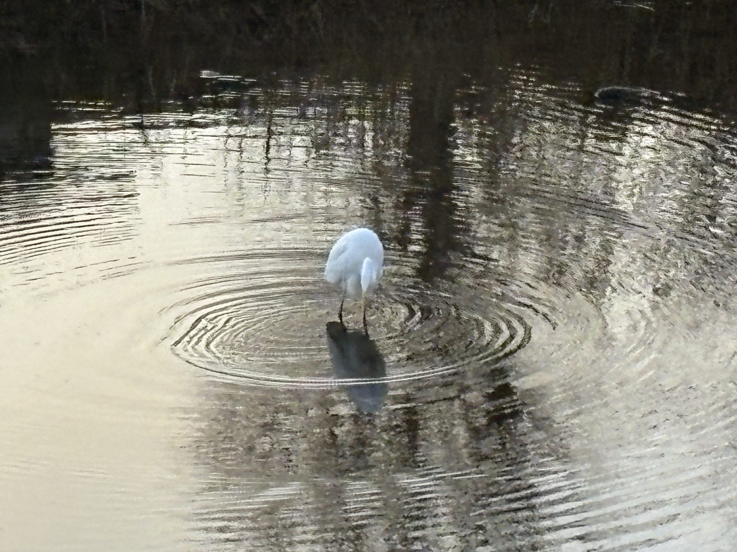 川では シラサギさんが 大きな水の輪を作って 朝食をゲットしました~🐛🍴🐛